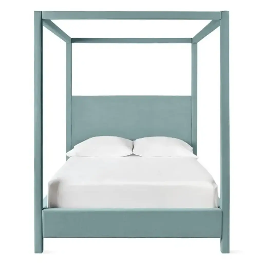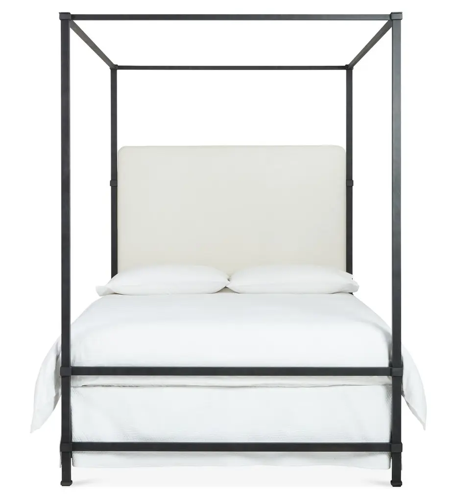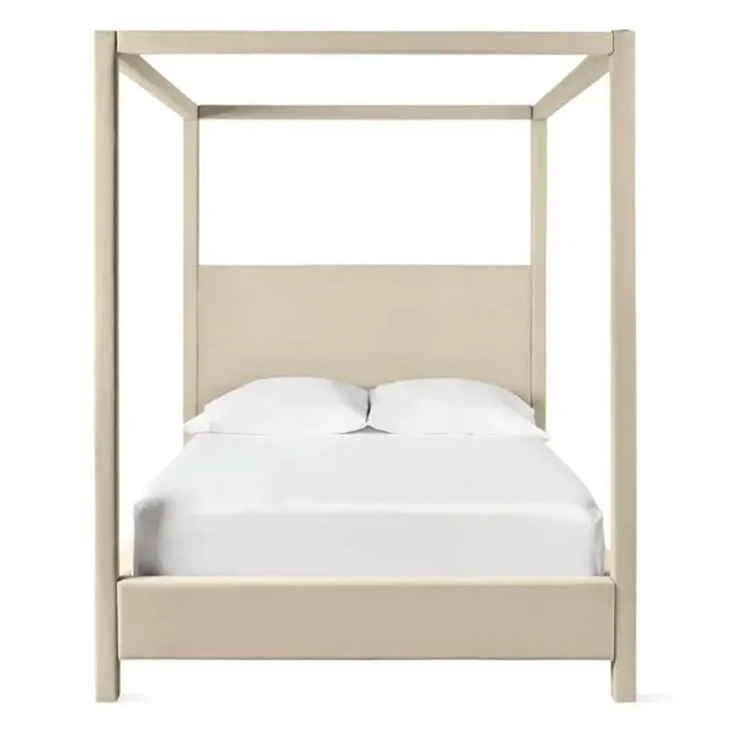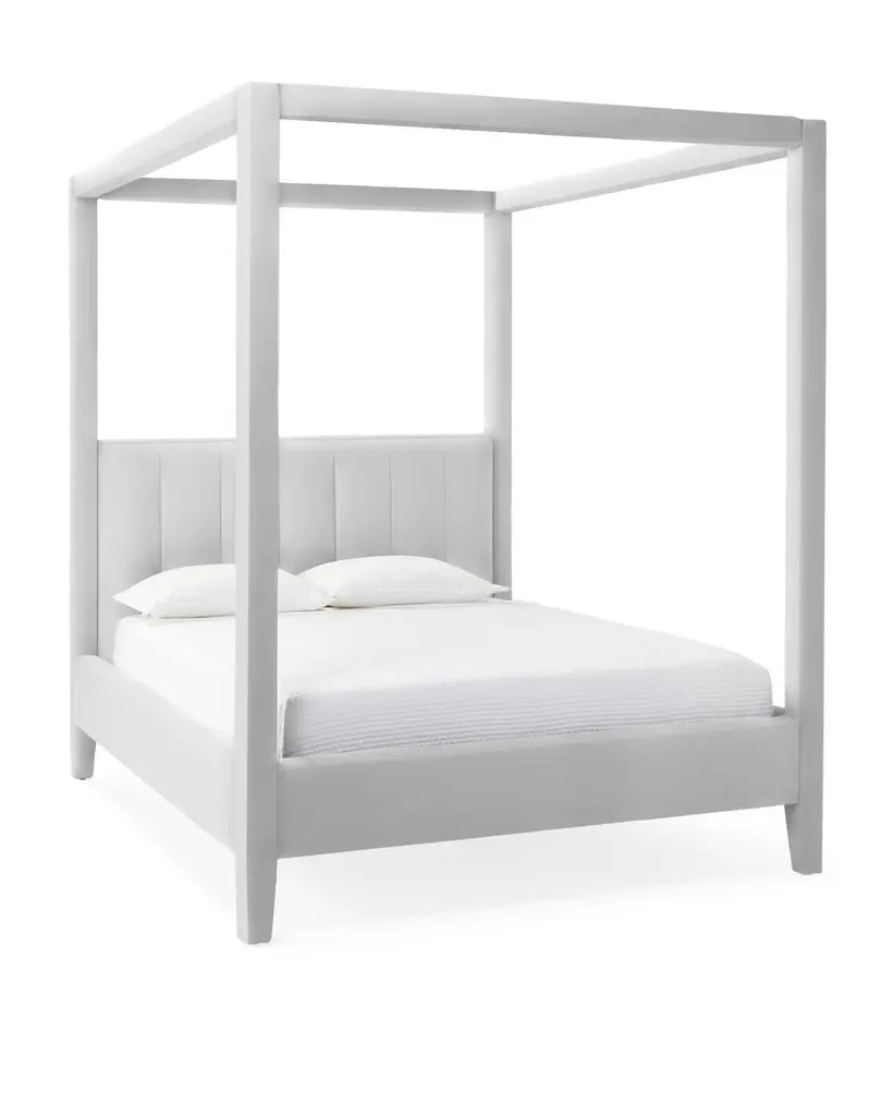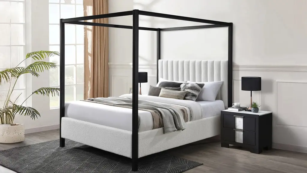 The Adalyn Canopy Bed is a striking statement piece, artfully merging the timeless elegance of a traditional four-poster design with the minimalism of contemporary aesthetics. Its bold frame offers a dramatic contrast to any bedroom setting, while the plush, tufted boucle-upholstered headboard exudes both sophistication and comfort. The luxurious fabric softens the bed's commanding presence, creating a perfect blend of style and relaxation for a serene sleeping experience.