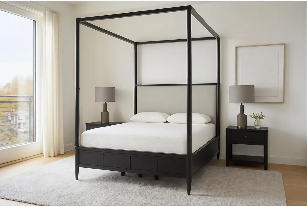 The Austen Black King Wood & Upholstered Platform Canopy Bed combines traditional style with modern functionality. Its sleek black finish and robust rubberwood frame offer both durability and aesthetic appeal. This bed also features practical side storage, perfect for keeping your bedroom clutter-free.