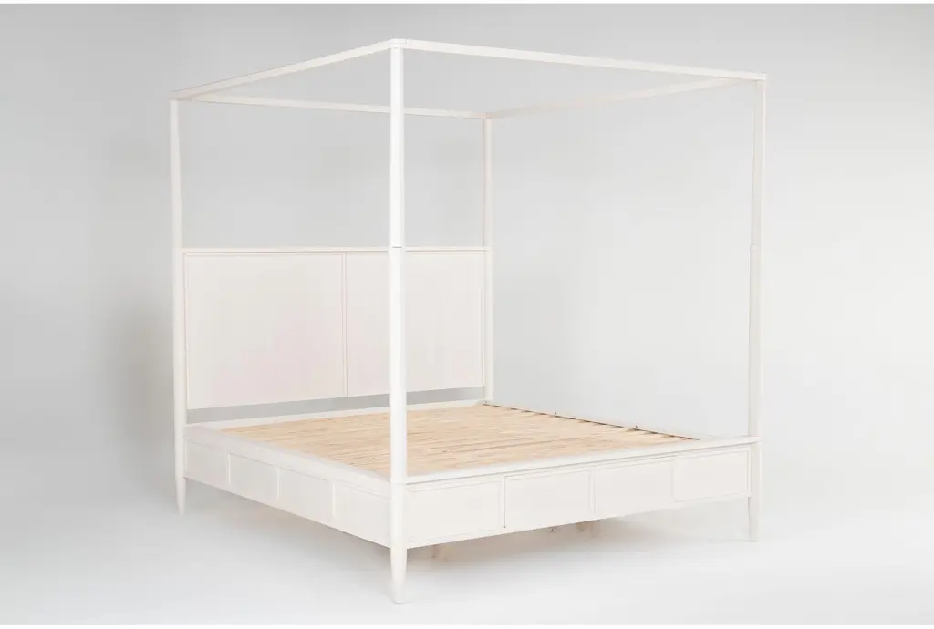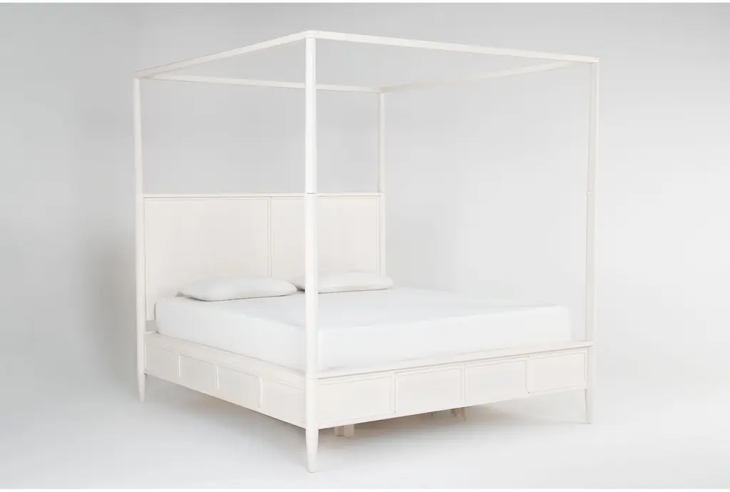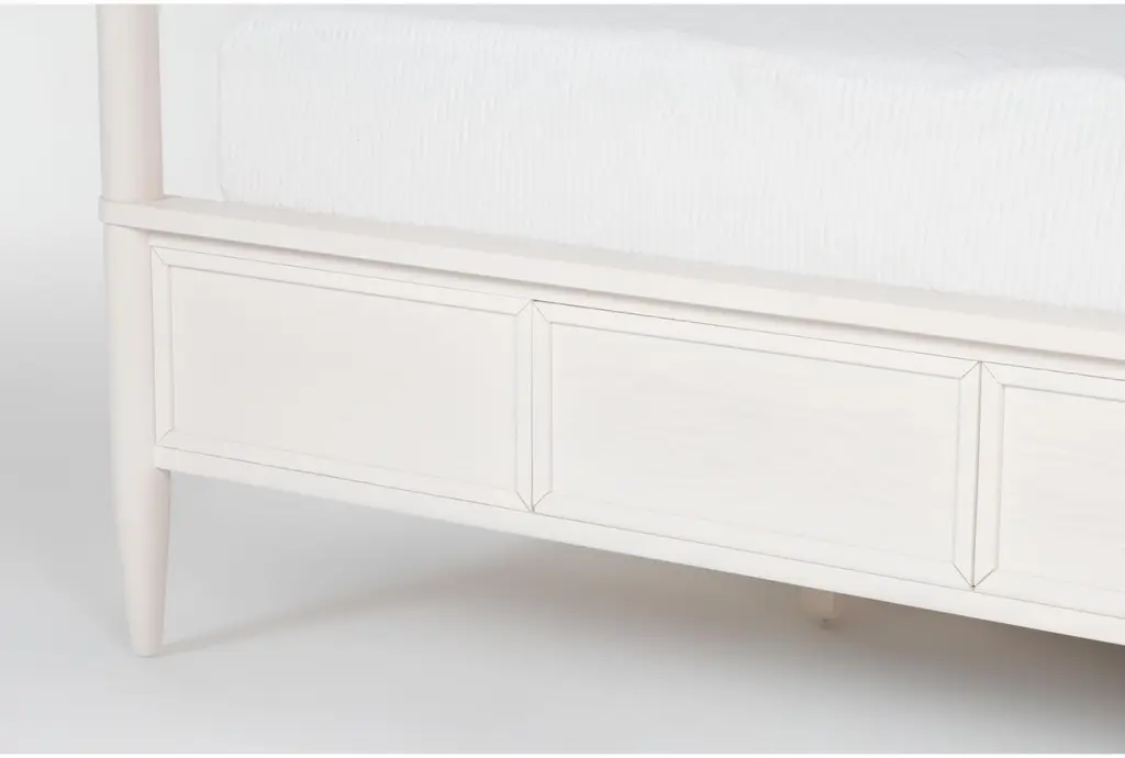As part of a complete whole-home collection that was developed entirely by Living Spaces, the Austen White canopy bed reflects a unique and thoughtful approach to design. With a refined all-American look and extensive functionality, this piece is a natural and purposeful addition to your bedroom. A textured warm white finish accentuates oak veneer and solid wood. Stately and elegant, long, turned and tapered posts distinguish the frame. We offer options with and without storage, so you can enjoy no storage, side storage, footboard storage, or side and footboard storage. Cedar lining in the drawers repels moths and insects, and keeps clothes fresh by eliminating mildew.