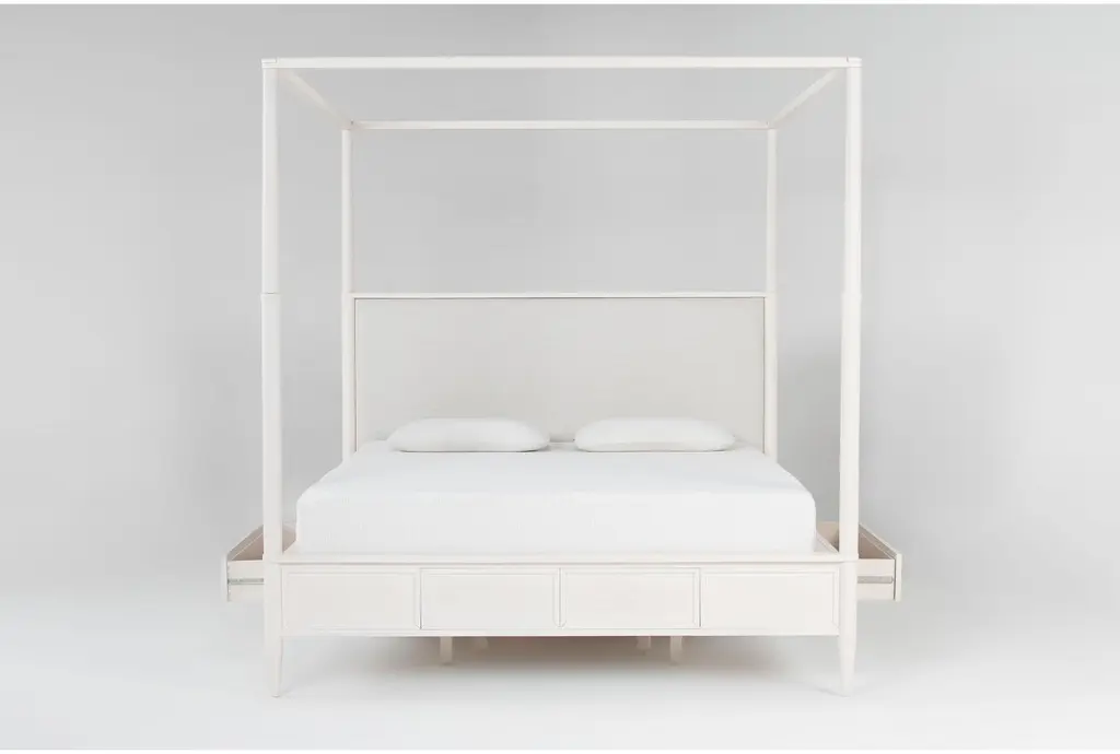 Austen White Queen Wood & Upholstered Platform Canopy Bed With Side Storage | Poster | Drawers