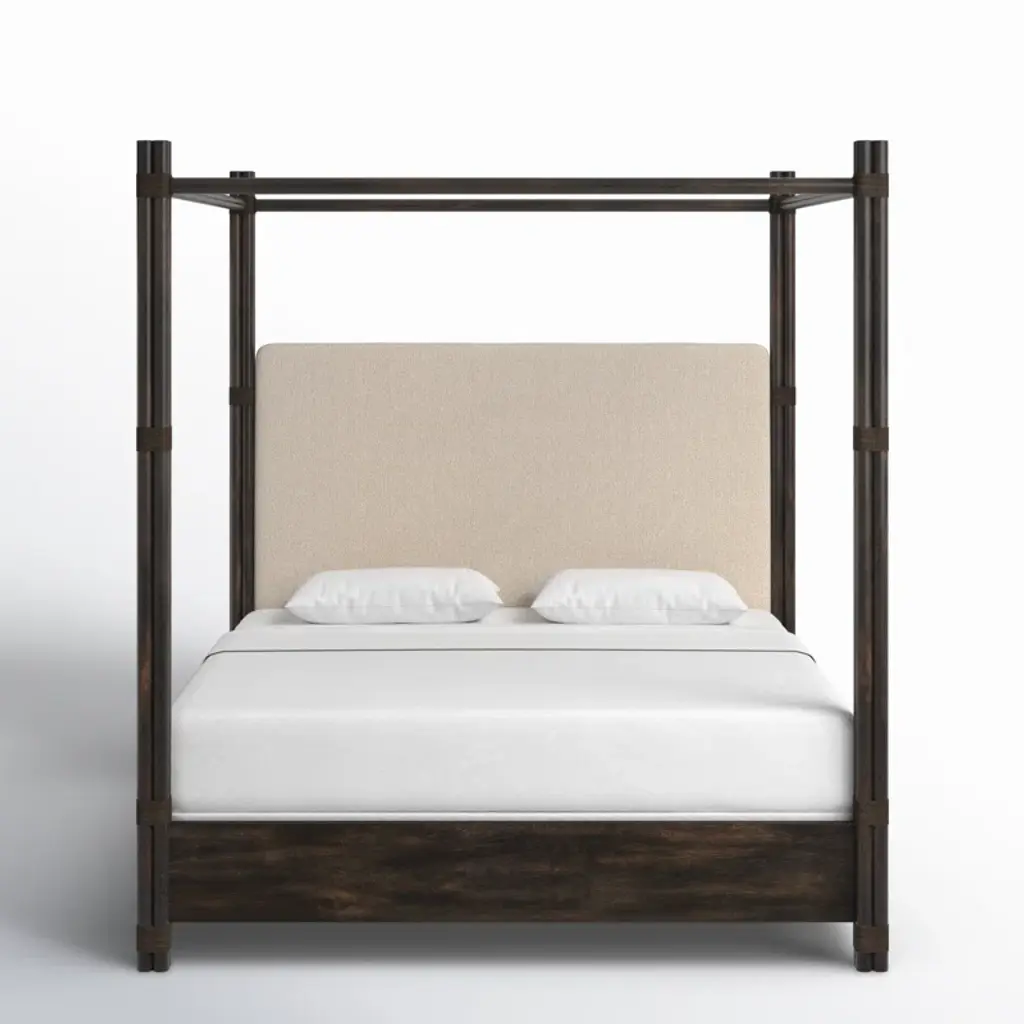 Elevate your bedroom with the sophisticated charm of our King Canopy Bed in a warm Sand Finish. This spacious King-Sized Lo-Post bed frame embodies transitional casual design, seamlessly blending with a variety of decor styles. Its standout Herringbone Pattern Headboard adds a unique textural element, creating a captivating focal point.Crafted with durable Mindi Veneers, this bed is built to endure while exuding timeless elegance. The Sand Colored Finish lends a touch of warmth and serenity to your sleeping sanctuary.