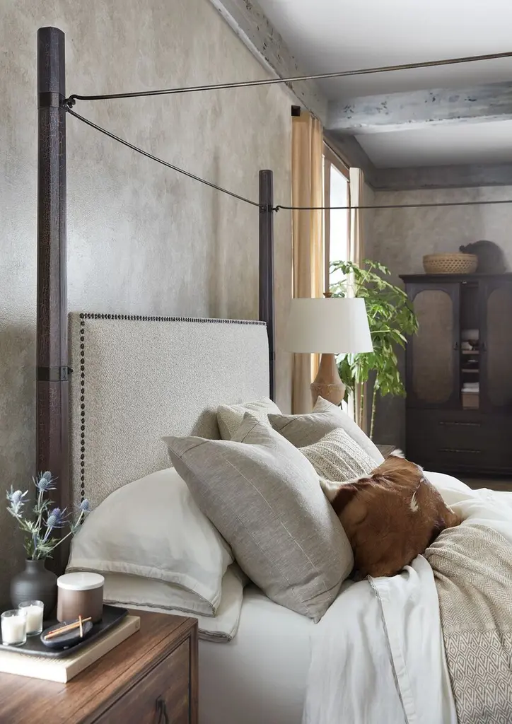 Big Sky Poster Upholstered Linen Canopy Bed, Charred Timber