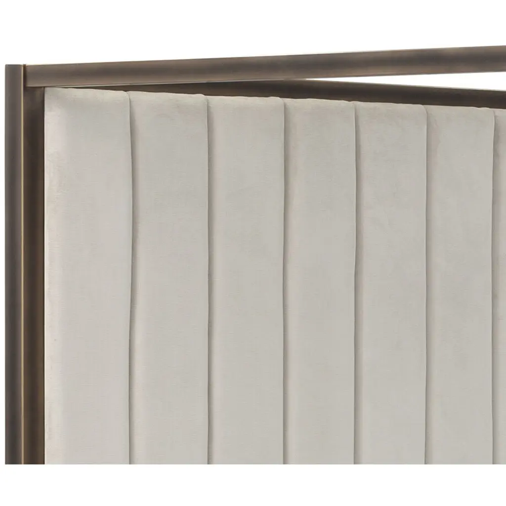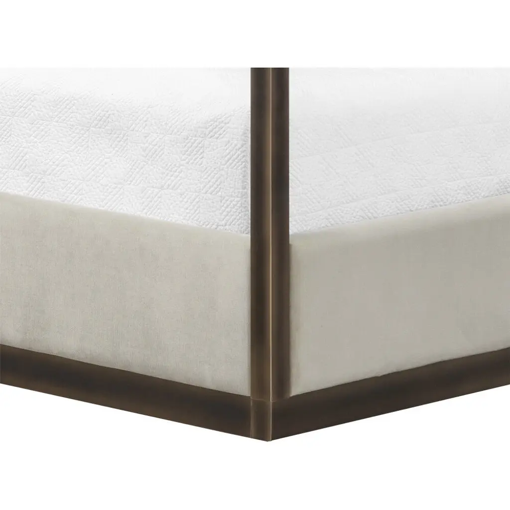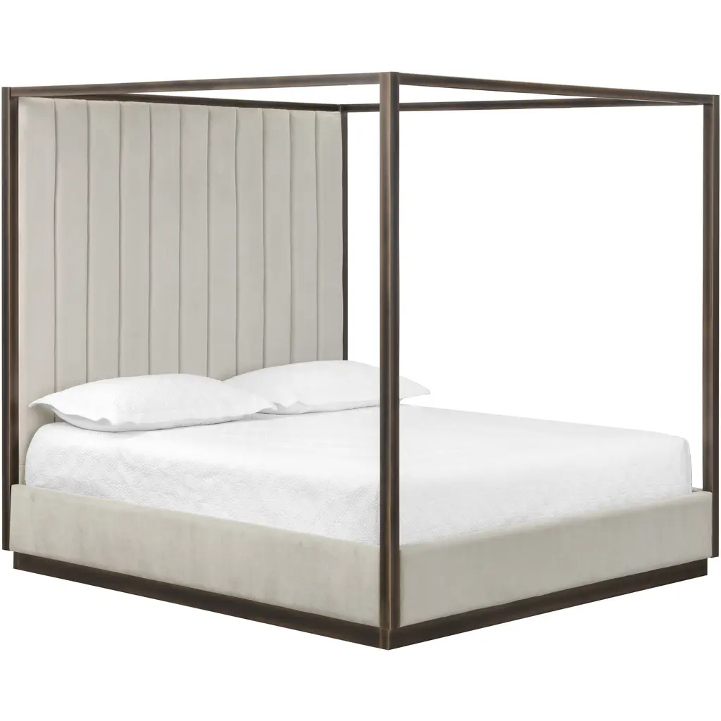 Boasting a regal design, this classic bed features a grand canopy frame that will certainly add a stunning appeal to any bedroom space. Upholstered in our piccolo processo performance fabric and features vertical tufting on the headboard. Completed with a rustic bronze iron frame. No box spring is required and slats are included. Performance fabric is moisture repellent, durable and easy to clean.