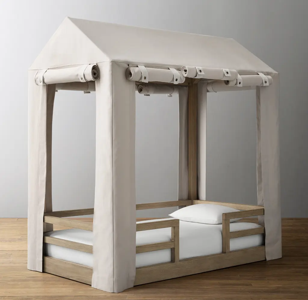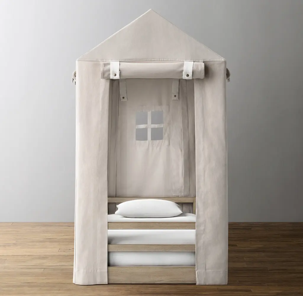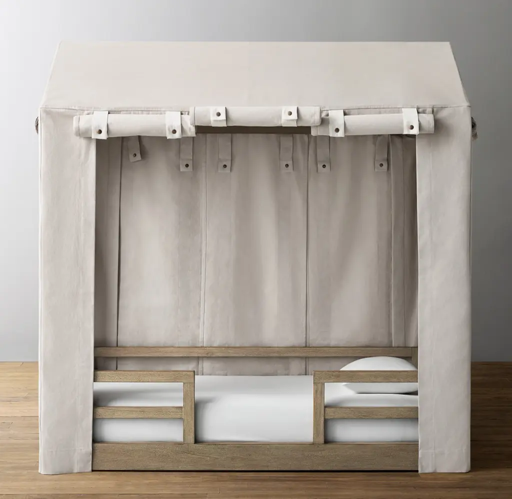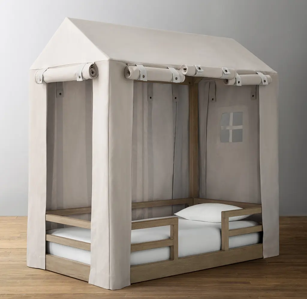 This sturdy canvas covering is specially designed to drape over the A-shaped frame of our Cole House Toddler Bed. Detailed with a paned window at one end and generously sized built-in storage pockets at the other, it infuses sleep and play with the rustic charms and down-home comfort of a backcountry bunkhouse.