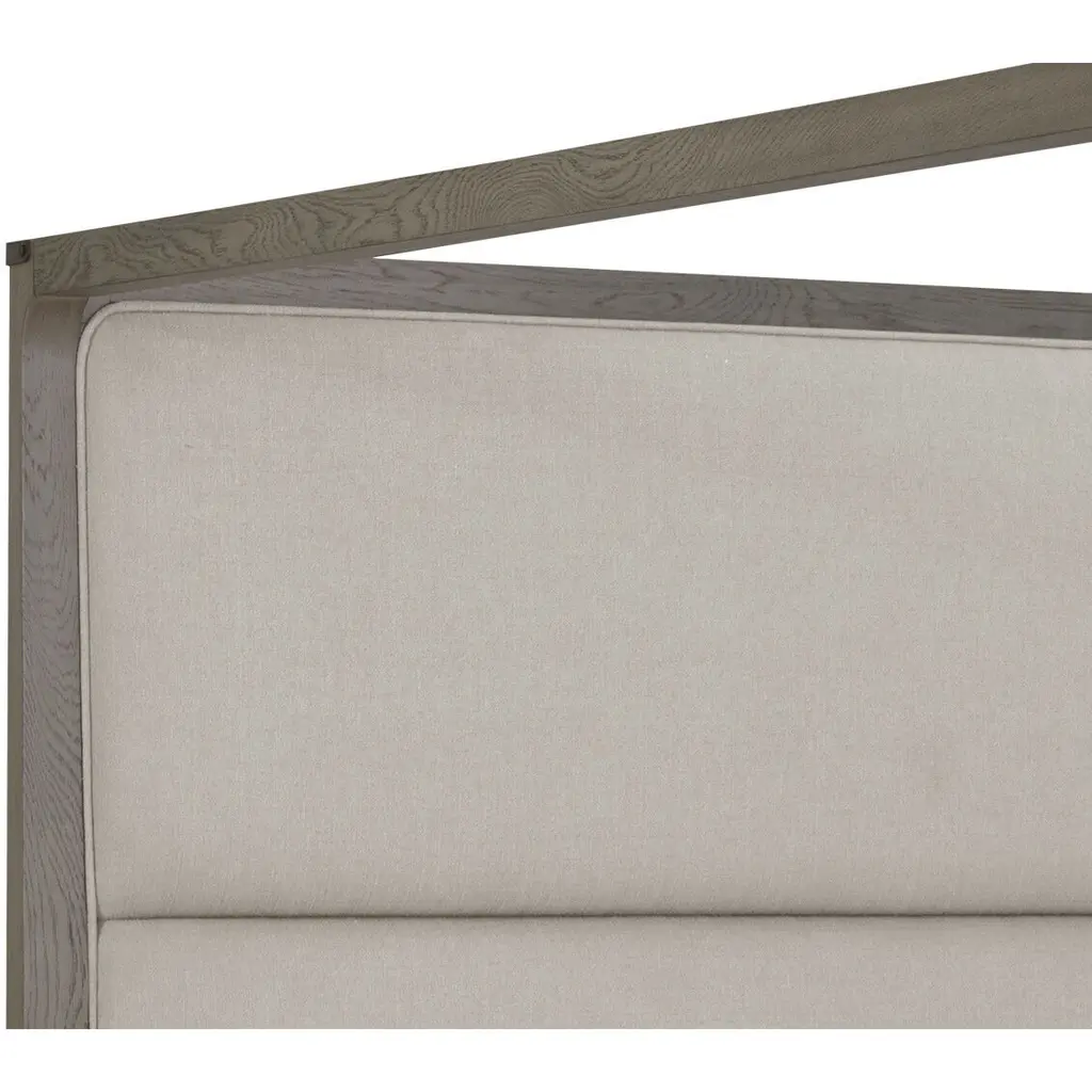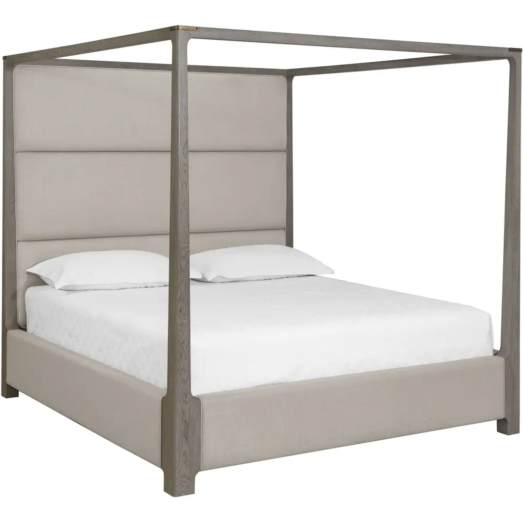 Clean lines lend the Danette Bed its minimalist silhouette. Features a canopy frame crafted from solid grey oak wood with warm steel brass accents. Upholstered in zenith taupe grey fabric with horizontal tufting on the headboard. No box spring is required and folding slats are included. As wood is an organic, porous material, these pieces will contain natural variation of texture and may also exhibit fine indentations and cracks. Wood pieces will also display a disparity of colour and grain, and visible knots and burls that add to the character of each piece.