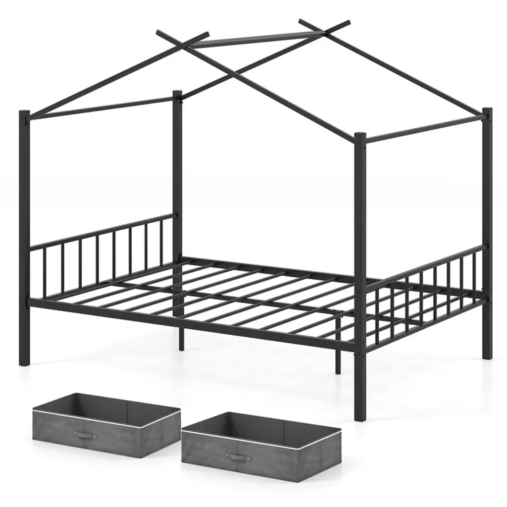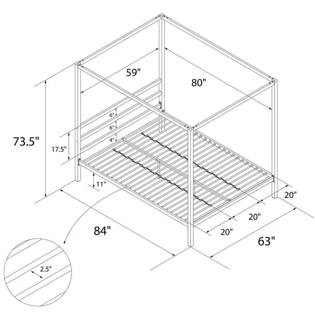Modern meets medieval influences with this striking canopy bed--the perfect addition to any bedroom, no matter your style. The straight, simple lines add a contemporary touch, with a built-in bed headboard and an all sleek metal finish for a truly timeless look. When it comes to comfort, this canopy bed has it all: a sturdy metal bed frame, as well as side rails for guaranteed stability and durability. The metal-slat base is designed to allow air to pass freely beneath your bed, which will keep you cool and ensure your mattress stays fresher for longer! No bed base or box spring required. Simply add your favorite bed mattress and some luxury bedding to create a distinct look that's all your own. The Modern canopy bed is available in twin, full, queen and king sizes in various colors.