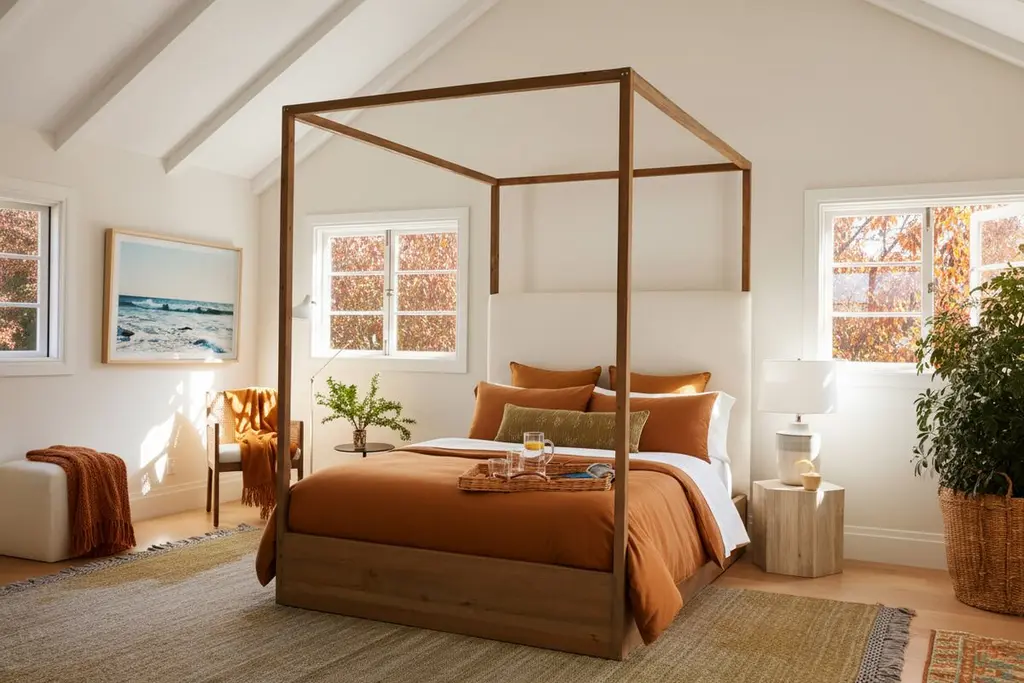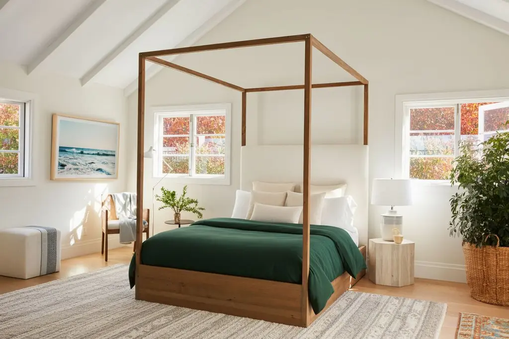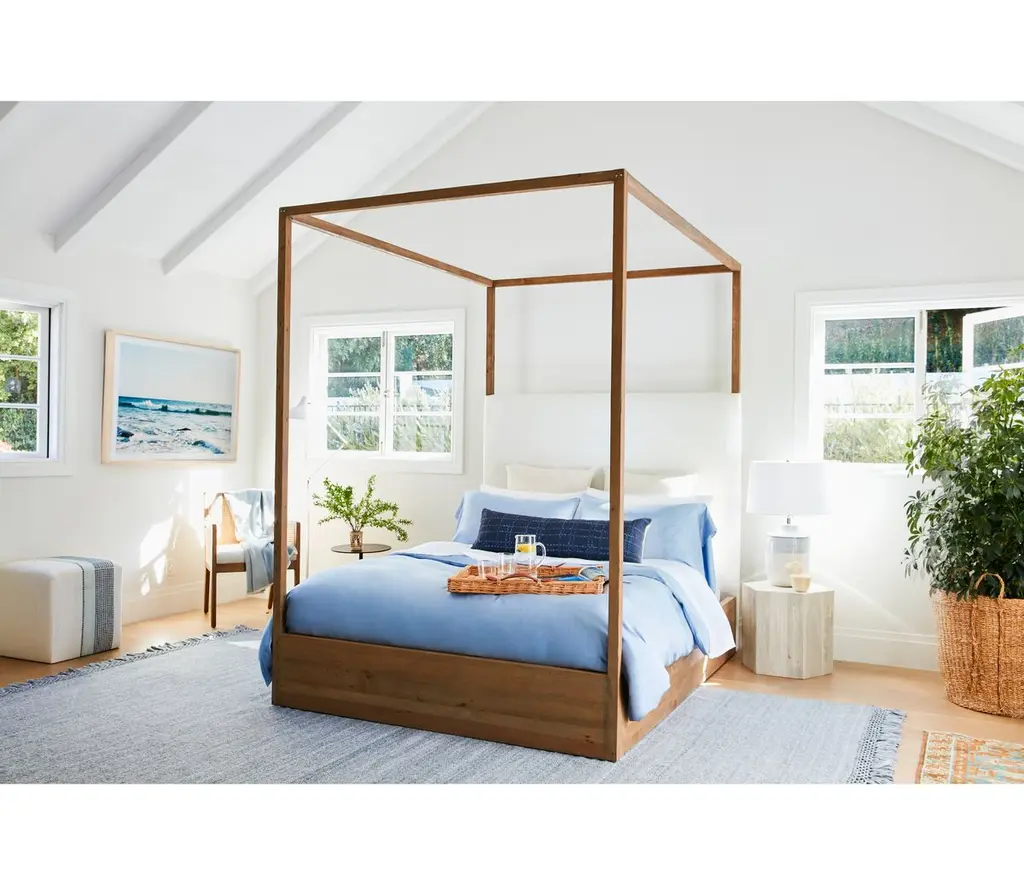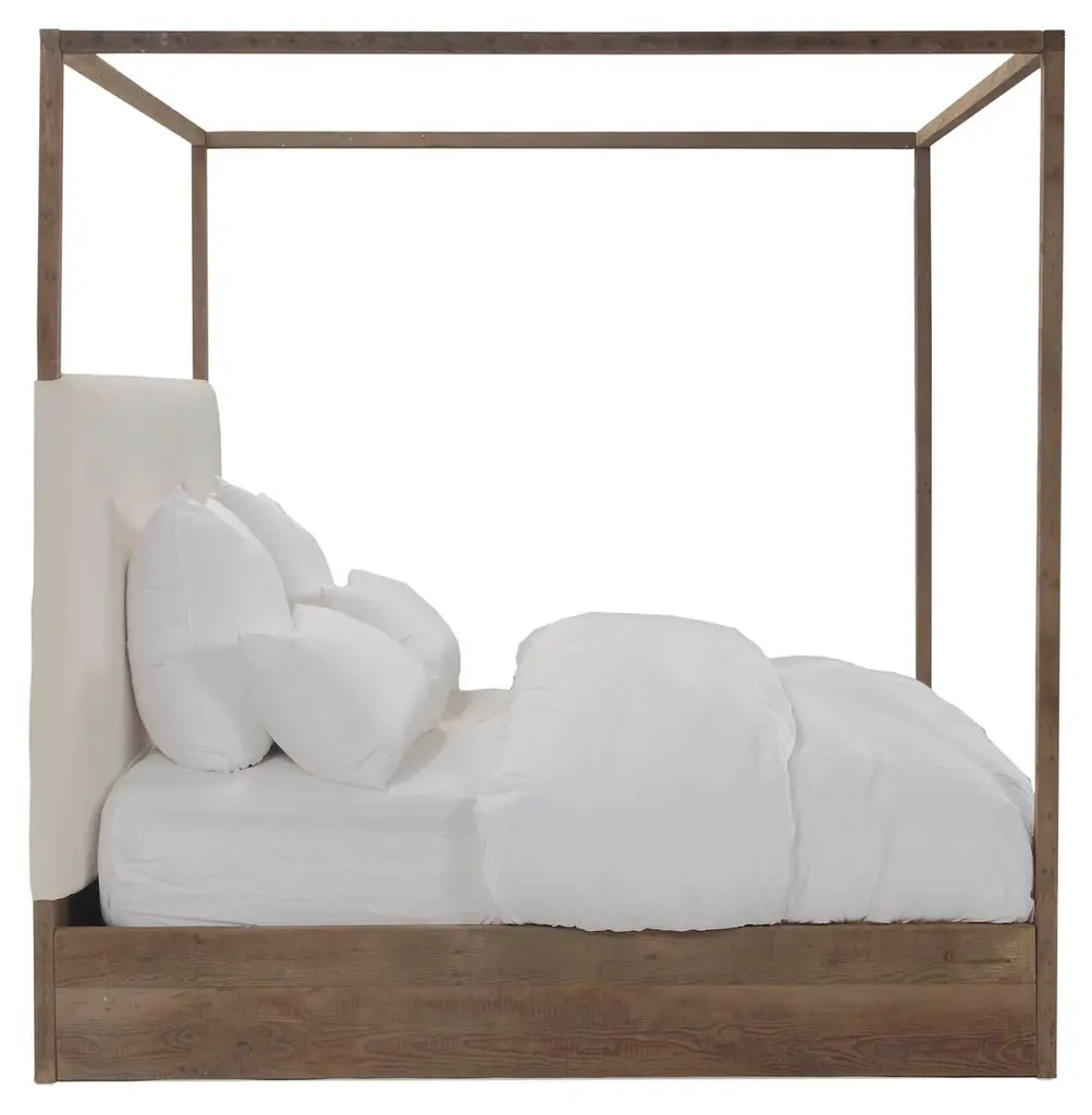 Beautifully carved of oak with a warm finish and linen-upholstered headboard, we love how this canopy bed brings height and drama to the room without overwhelming it. Mattress and box spring required.