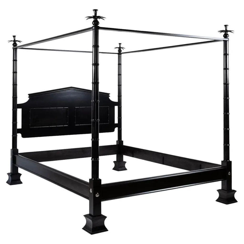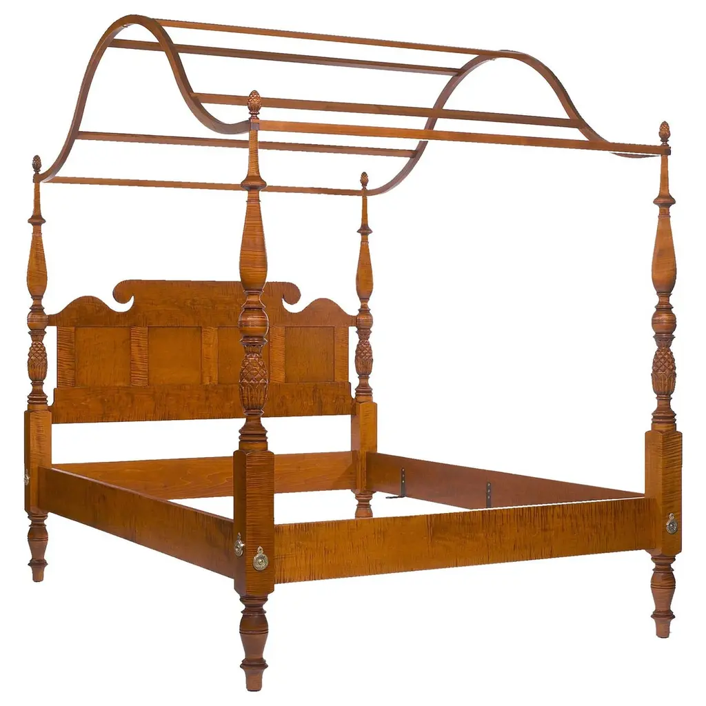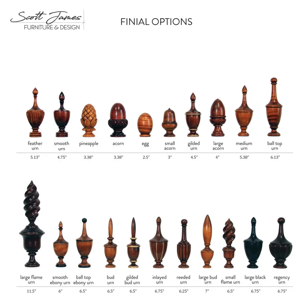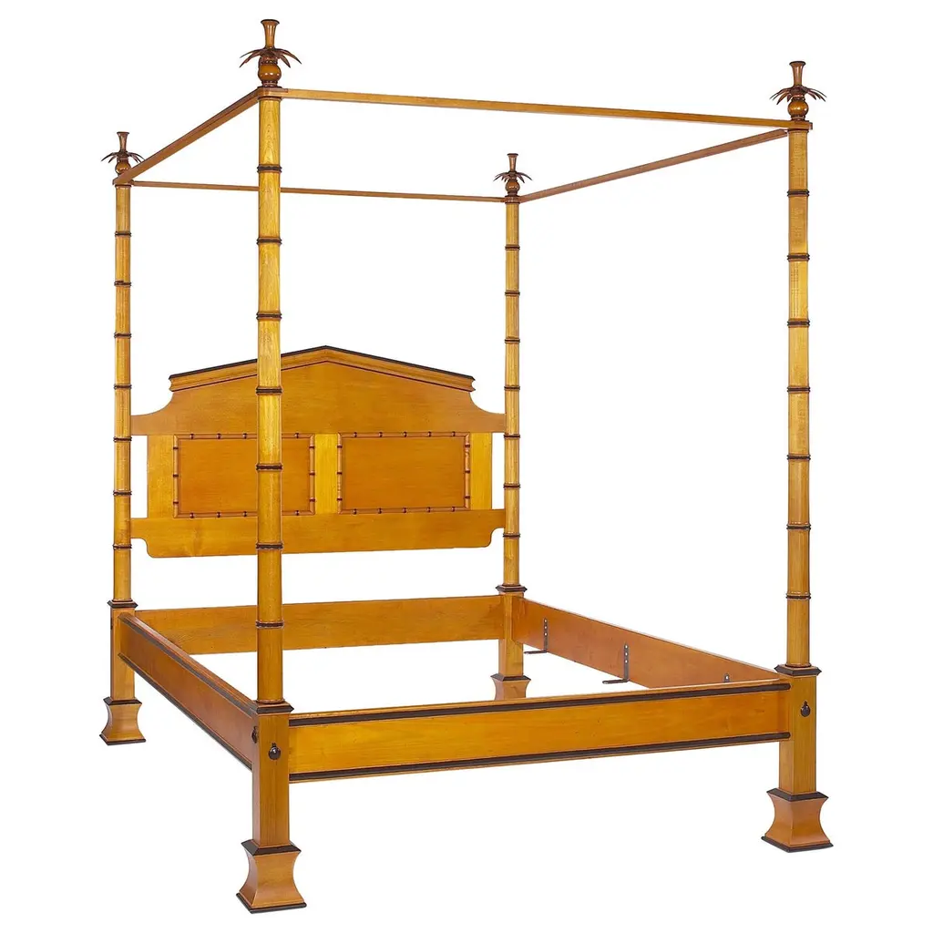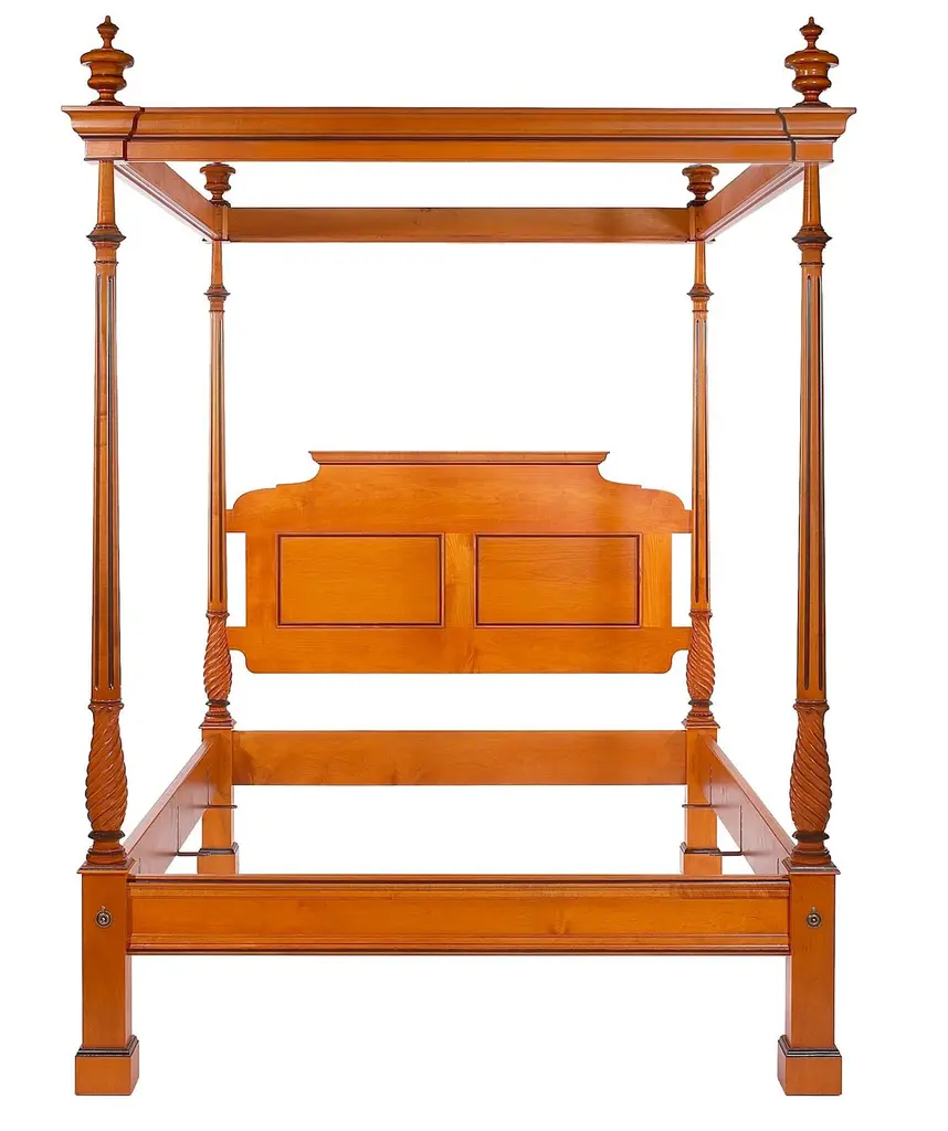 The Byron is a theatrical piece, as shown in our specialty honey stained maple finish with carefully hand painted ebonized detailing creating a graphic symmetry. It is shown with a Cornice Valence, a complex detailed Canopy, signature to this style. The Byron is also available in solid stain options, alternate pricing below. Posts heights can be customized to fit your ceiling height. Finial options are shown in our detail images, note that various finials change the overall post and canopy height. This bed is available in multiple wood types, sizes and finishes, also note our other half cornice valence option and four poster option.Those who are drawn to the Cornice Valence may add it to other bed styles for an upcharge.