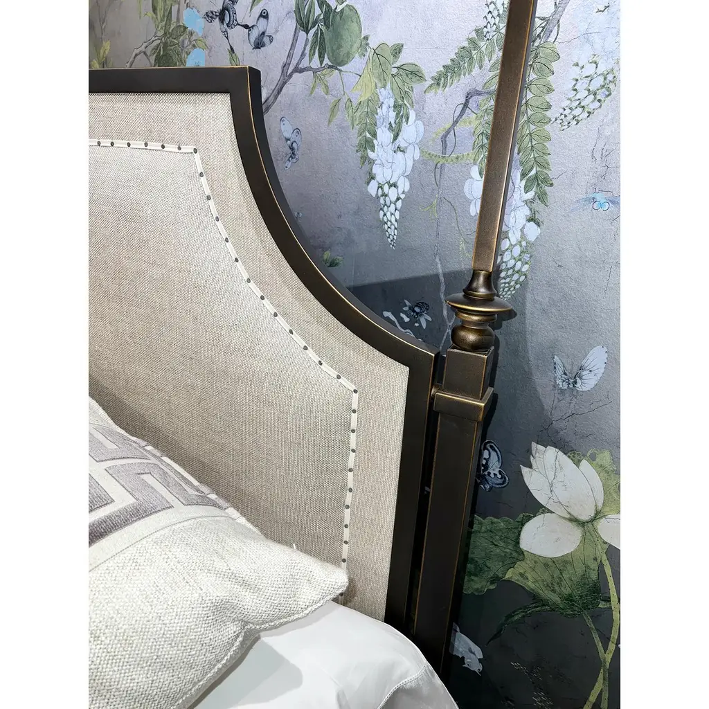 French Metal Canopy Bed, King Size, with a bronze finish metal canopy frame with a padded upholstered headboard in a neutral linen fabric. The frame with finials, square posts, and raised on square tapered legs. Dimensions: 80" W x 86" D x 89" H