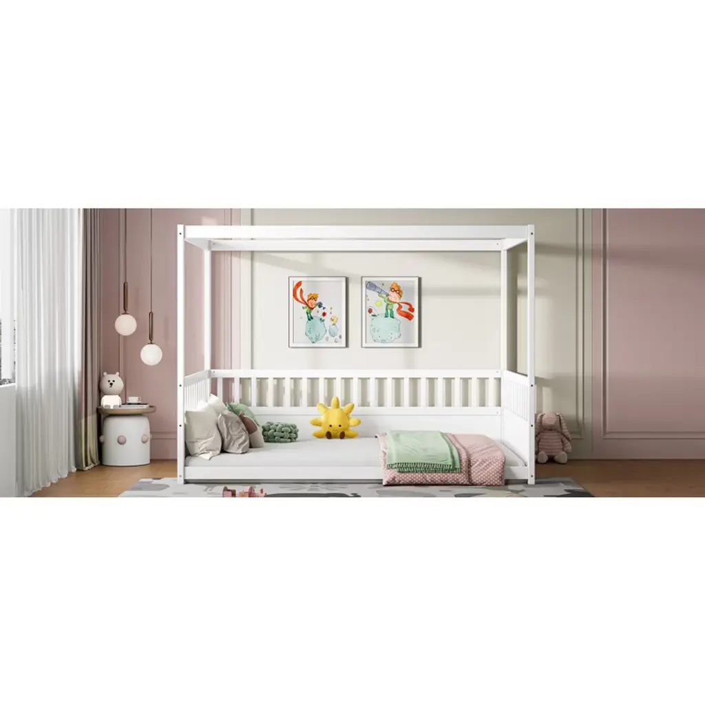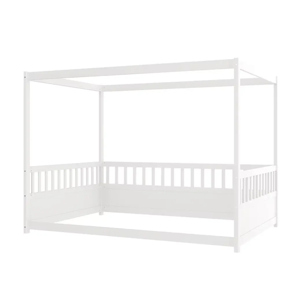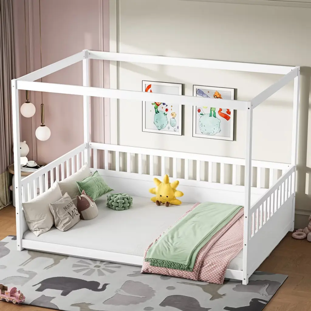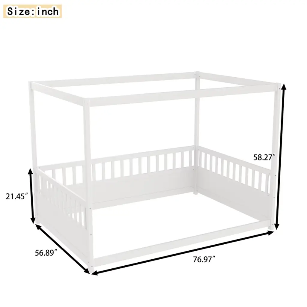 Product Features Children's Style Drop-down Roof Bed: This wooden canopy bed is equipped with full-length support at the top. You can add curtains that your child likes to create a cozy sleeping space, or decorate this drop-down bed with colorful flags, lights, or photos.Safe Double-tier Bed: This bed frame is equipped with an extremely high bed rail (21.45 inches) to provide better protection for children when they sleep. The design of three-sided bed rails makes it convenient for children to enter and exit. What's more important is that this children's double-tier bed is equipped with higher wooden railings, which not only ensures higher stability but also reduces potential safety hazards, allowing children to enjoy peaceful sleep.Floor Height Montessori Bed for Boys and Girls: This elegant twin floor bed features a low-to-ground design which allows your kids to get in or out easily. You can place your mattress directly on the floor.Sturdy Bed Frame: The twin canopy bed frame is crafted mainly from premium pine wood and quality engineered wood, making it sturdy and durable.Easy Assembly: Our Montessori floor bed is delivered in one package, along with the manual instruction and full set of hardware necessary to guide you through the process of assembly, and the bed will definitely be assembled conveniently. Description Design of Wooden Overhead Bed You can add curtains that children like to create a cozy sleeping space, or decorate it with colorful flags, lighting fixtures, or photos. 21.45-inch Guardrail Design with Baffle Panels The 21.45-inch guardrail design provides enhanced safety protection for children during sleep rolling. The guardrail is more suitable for containing items that children might drop from beds. It is designed to prevent accidents caused by children's falling and rolling. The guardrail is made of durable material for long-lasting use. Three-sided Fence Design Convenient for children to enter and exit easily. Product Information Product Type: French BedSize: FullMaterial (main): Pine + PlywoodOverall Product Dimension: 76.97'' x 56.89'' x 58.27''Package Number: 1Package Contents: 1 x Bed, 1 x Accessory Kit, 1 x Instructions