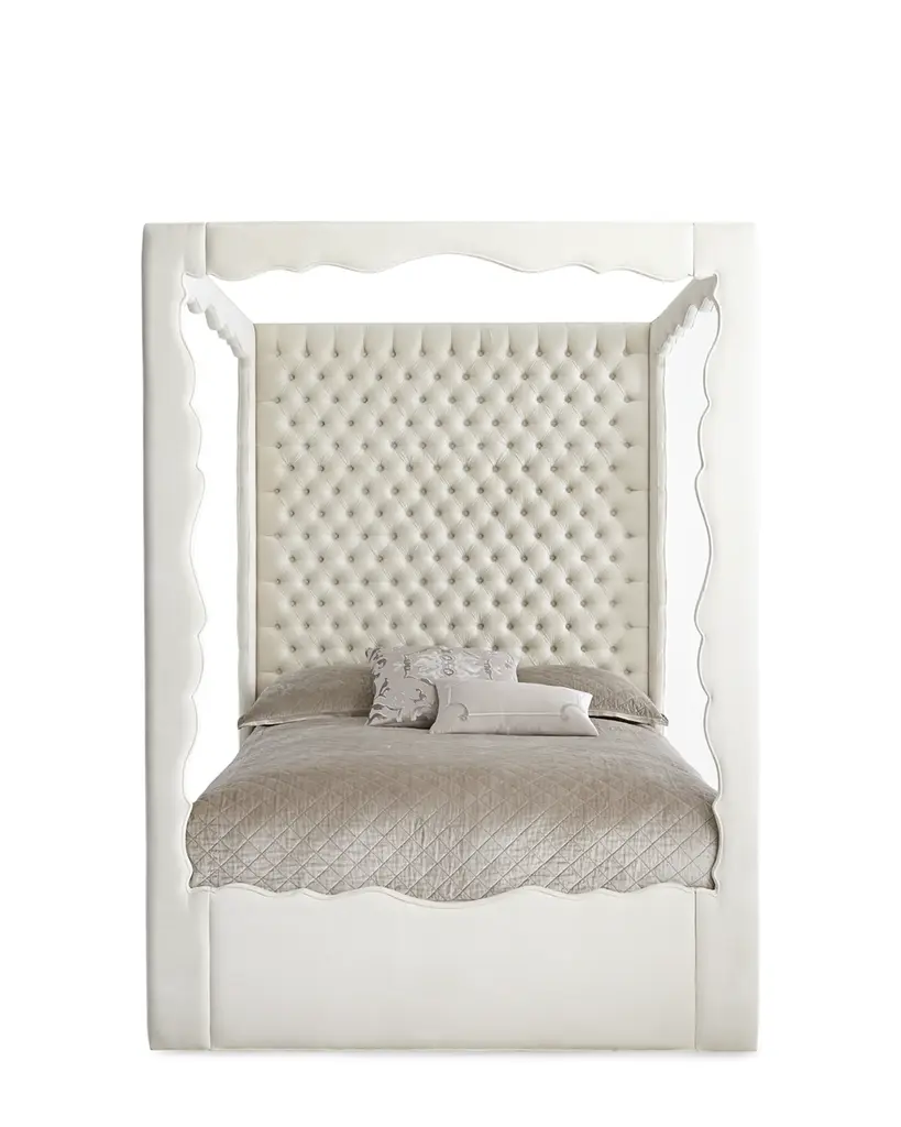 EXCLUSIVELY OURS. Bed has scalloped Hardwood frame with button-tufted headboard. Cotton upholstery in a versatile cream color. 82"W x 86.5"L x 89"T. Handcrafted in the USA of imported materials. Boxed weight, approximately 500 lbs. Please note that this item may require additional shipping charges. About Haute House: Haute House is a Hollywood-based design and manufacturing company that creates haute couture furnishings for the home. Designer and owner Casey Fisher has been designing furniture for years as an upholstery, textile, and retail space stylist. Instead of designing a line offering just one look, the Haute House line consists of three looks that offer something for every taste. However, there is one element present in every Haute House design—a great sense of style.