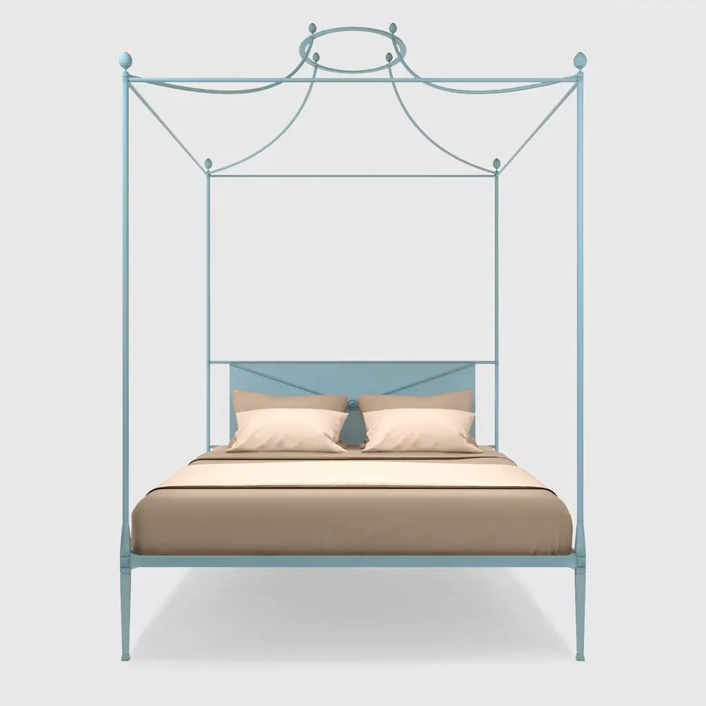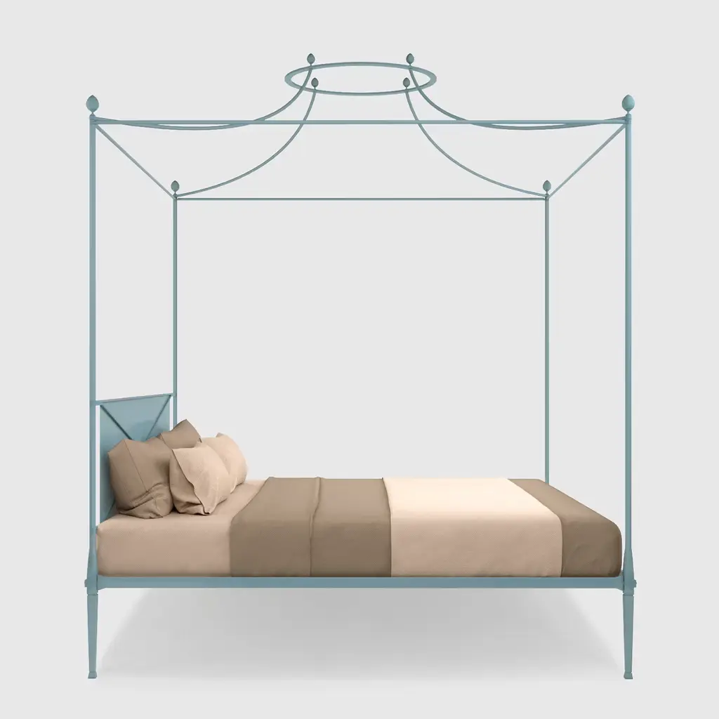 Graceful, gentle and with a sense of romance. A bed with balanced, winding yet slender forms, conveys traces of royalty through its upper section. A solid square iron frame with tapered legs in the form of a truncated pyramid. The headboard is made of 10-millimeter square iron, with a turned frieze and soundproofed sheet metal. The top is comprised of round iron spokes and a flat iron oval. Bed base included. The mattress is not included.