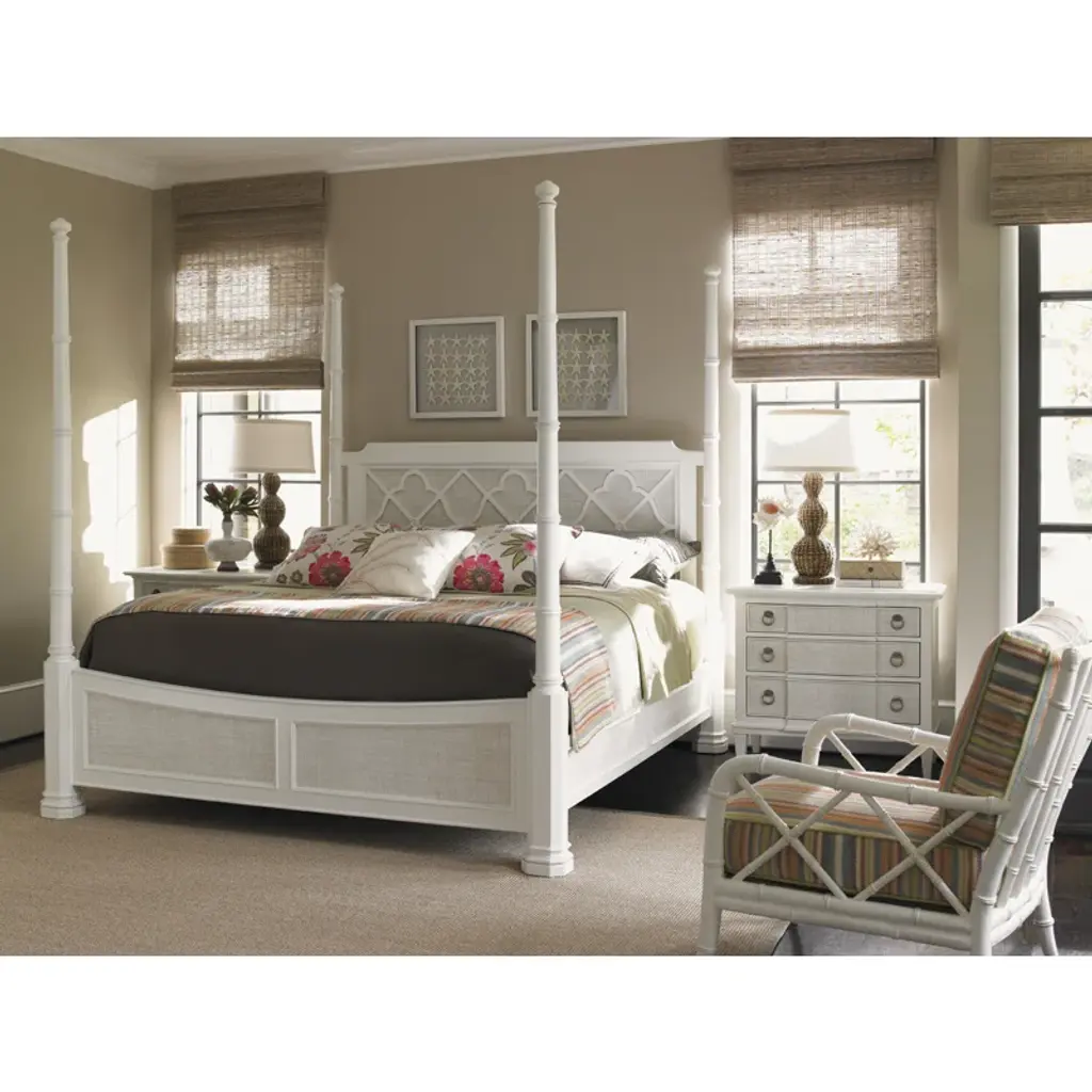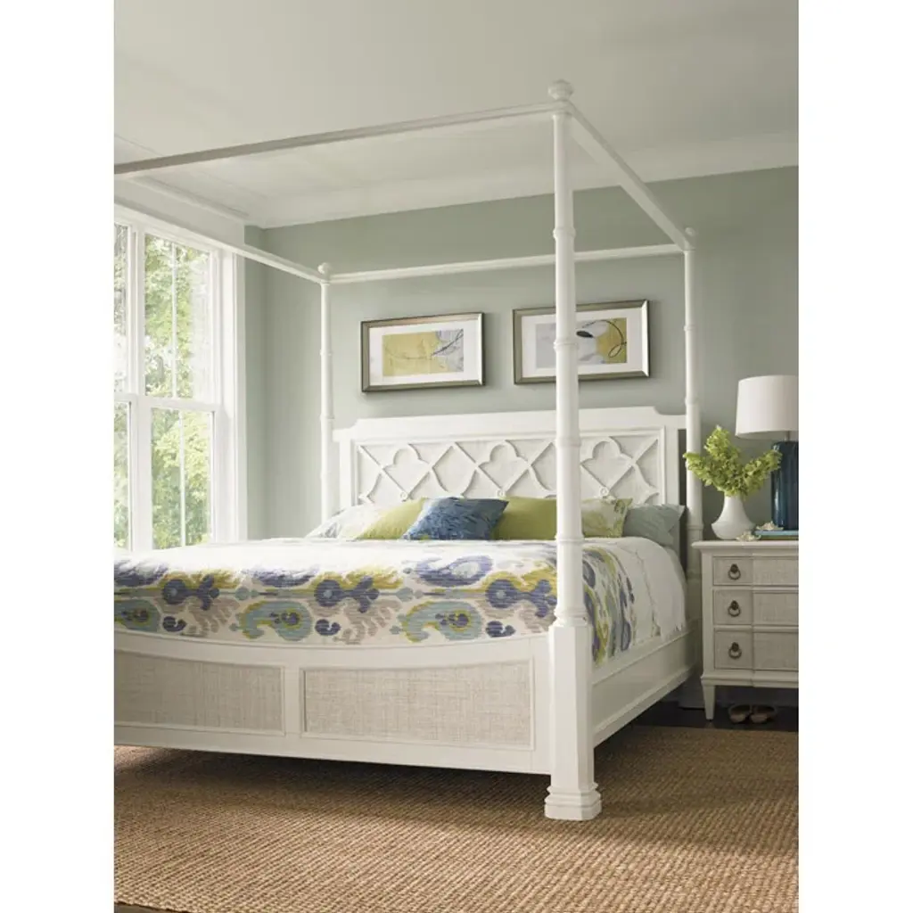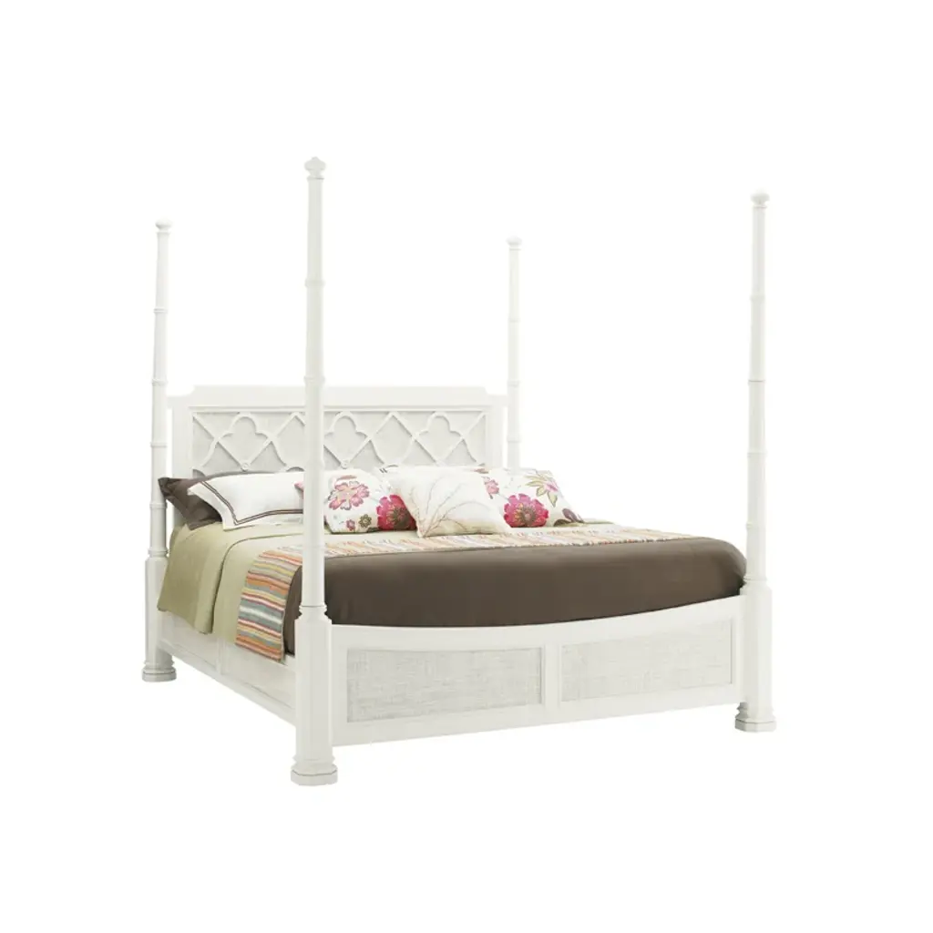 With classic British architectural design, a distinctive quatrefoil-and-diamond pattern is a recurring theme throughout the ivory key. The headboard features the design over the raffia panel. Raffia is also found on the footboard and side rails.