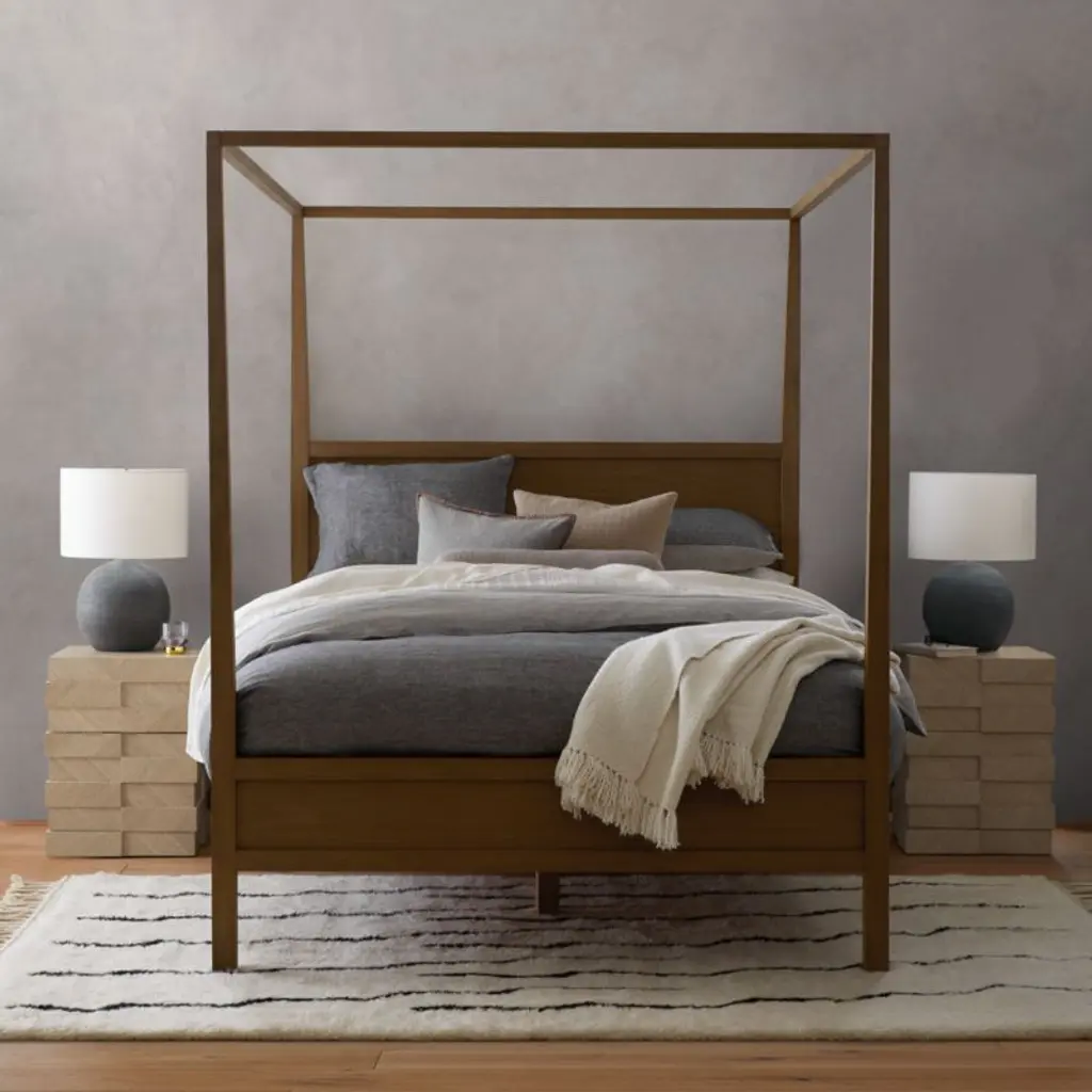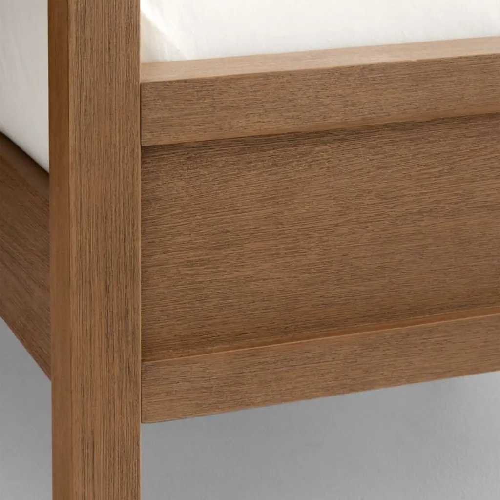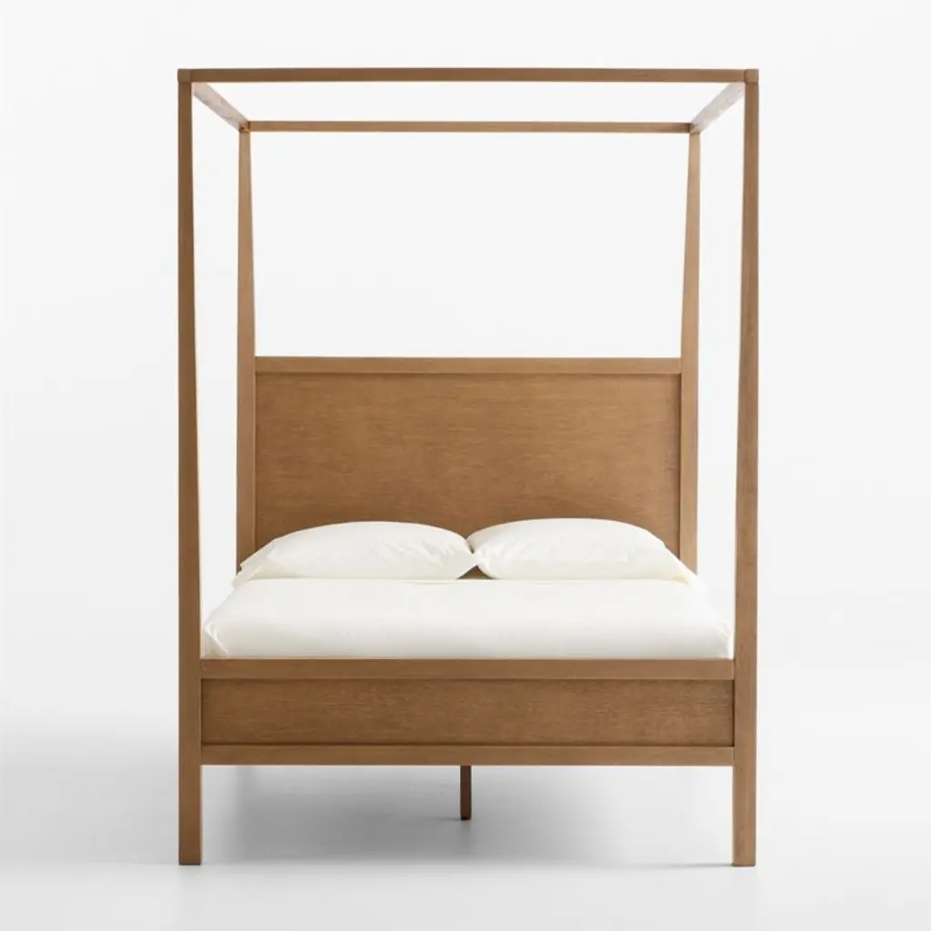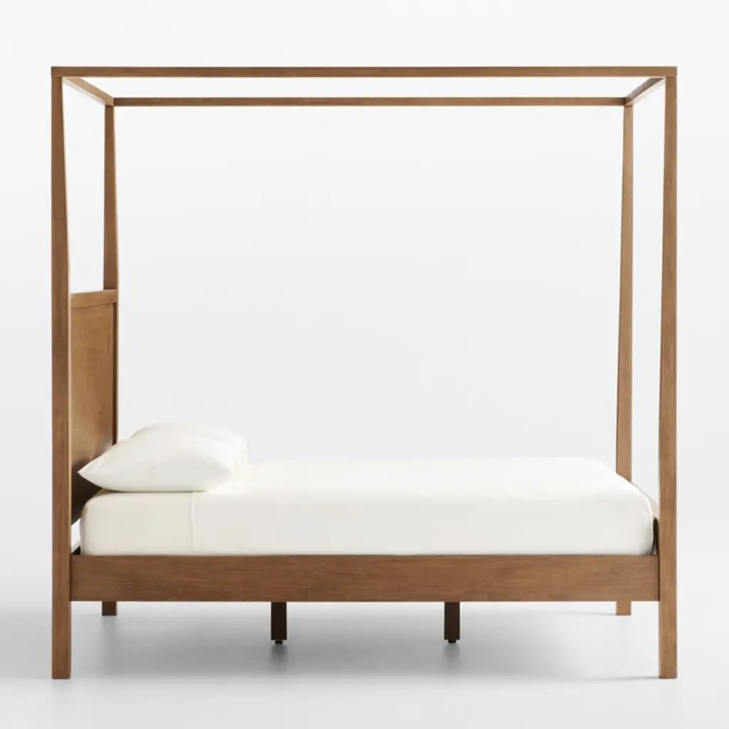 Keane streamlines the traditional canopy bed into an open, airy cube of beautiful mahogany and meranti woods. Architectural but never formal, the canopy bed features ever-so-slightly tapered posts anchored by simple panel head- and footboards. A warm driftwood finish gives the bed a fresh look. Our bestselling Keane collection is a Crate & Barrel exclusive.