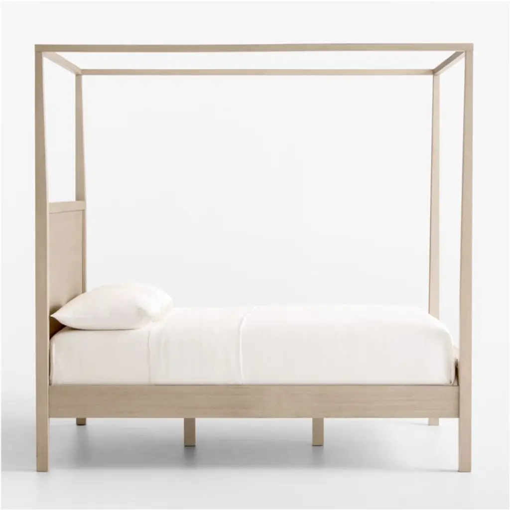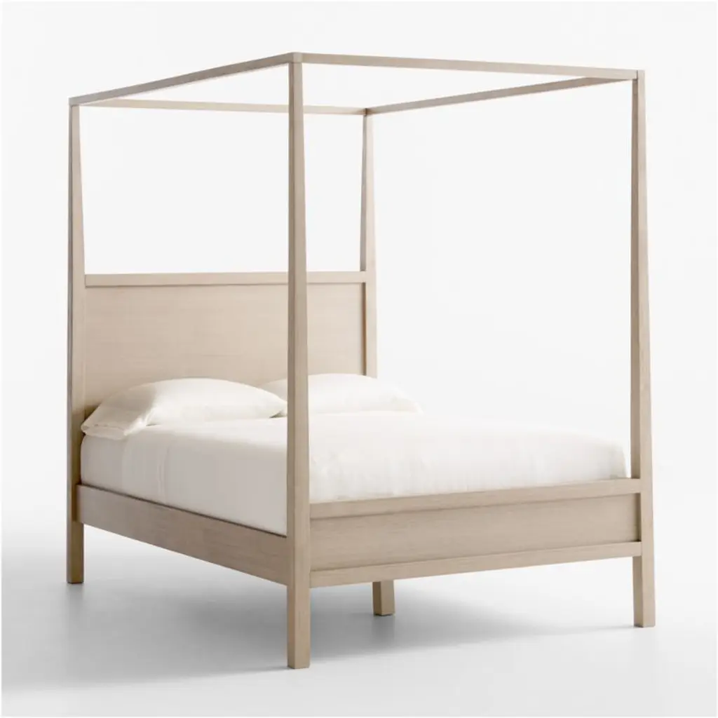 Keane streamlines the traditional canopy bed into an open, airy cube of beautiful mahogany and meranti woods with a natural finish. Architectural but never formal, the canopy bed features ever-so-slightly tapered posts anchored by simple panel head- and footboards. Our best-selling Keane collection is a Crate & Barrel exclusive.