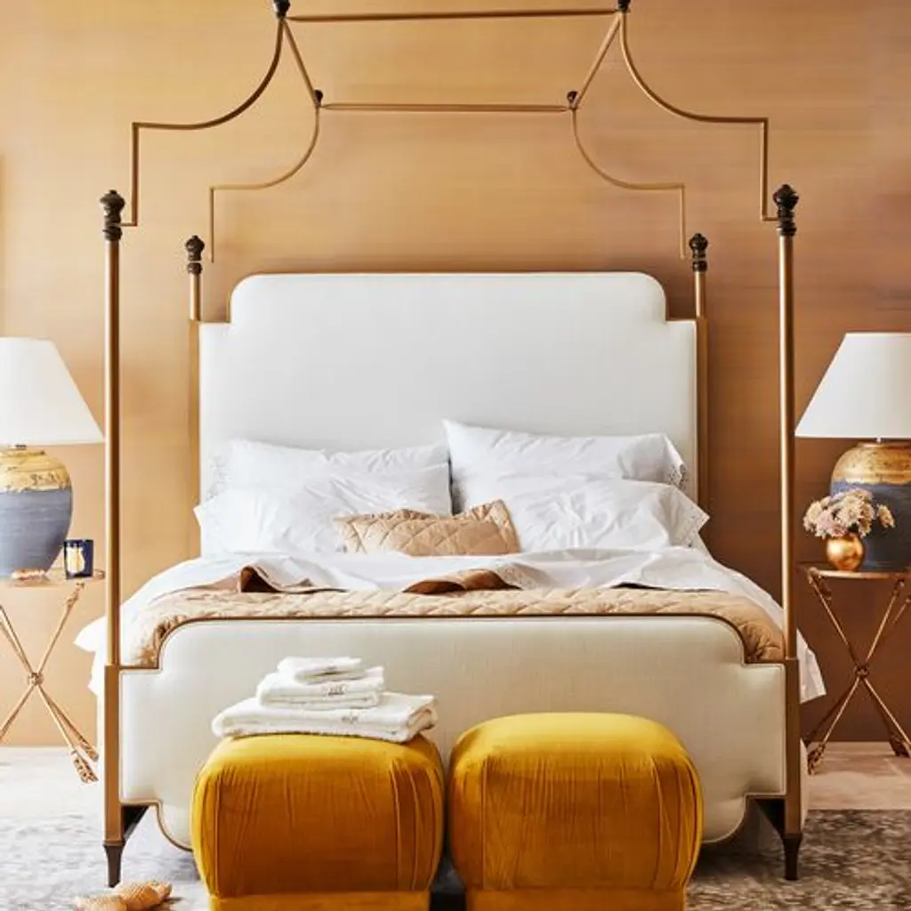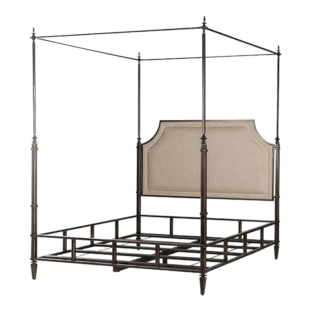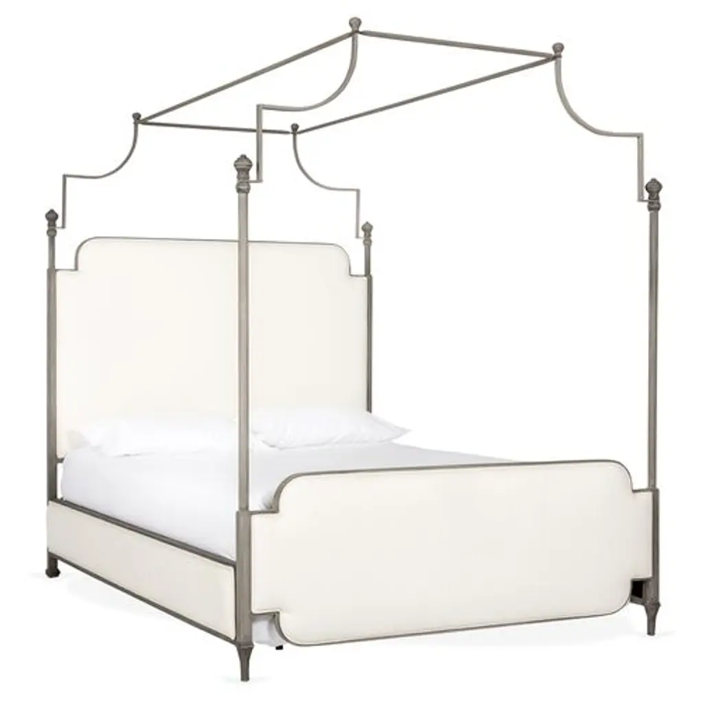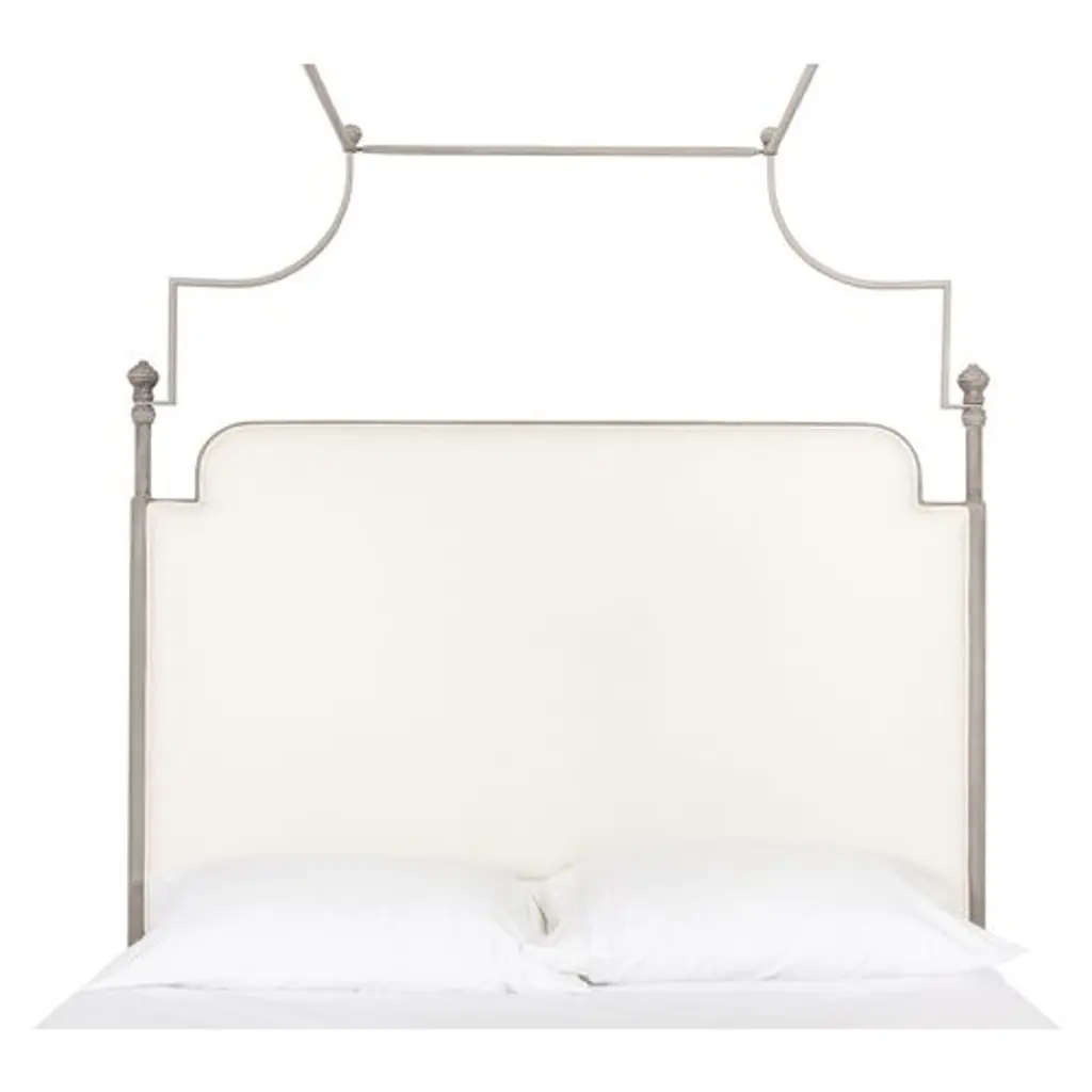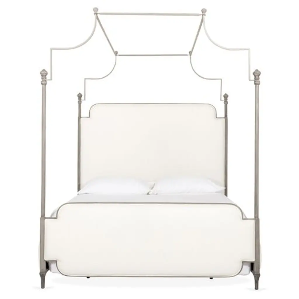 Exclusive to One Kings Lane: This towering bed is made with a sculptural iron canopy and foam-filled linen-blend upholstery that beautifully softens the look. Mattress and box spring required. Made in the USA.