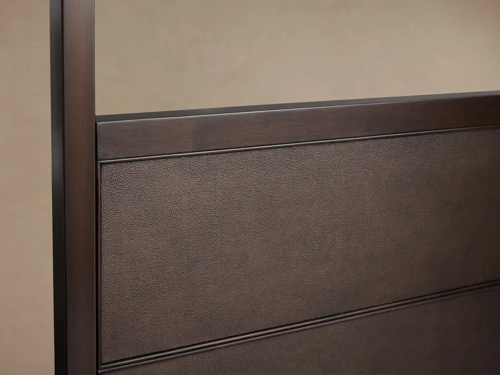 Featuring a sleek aesthetic, our Malone collection is artisan-crafted from solid parawood or oak wood—depending on your preferred finish—and surfaced with walnut or elm wood veneers. Insets made from reconstituted leather embossed with a shagreen pattern are complemented by hand-applied finishes to give this collection a modern look with intriguing textural details.