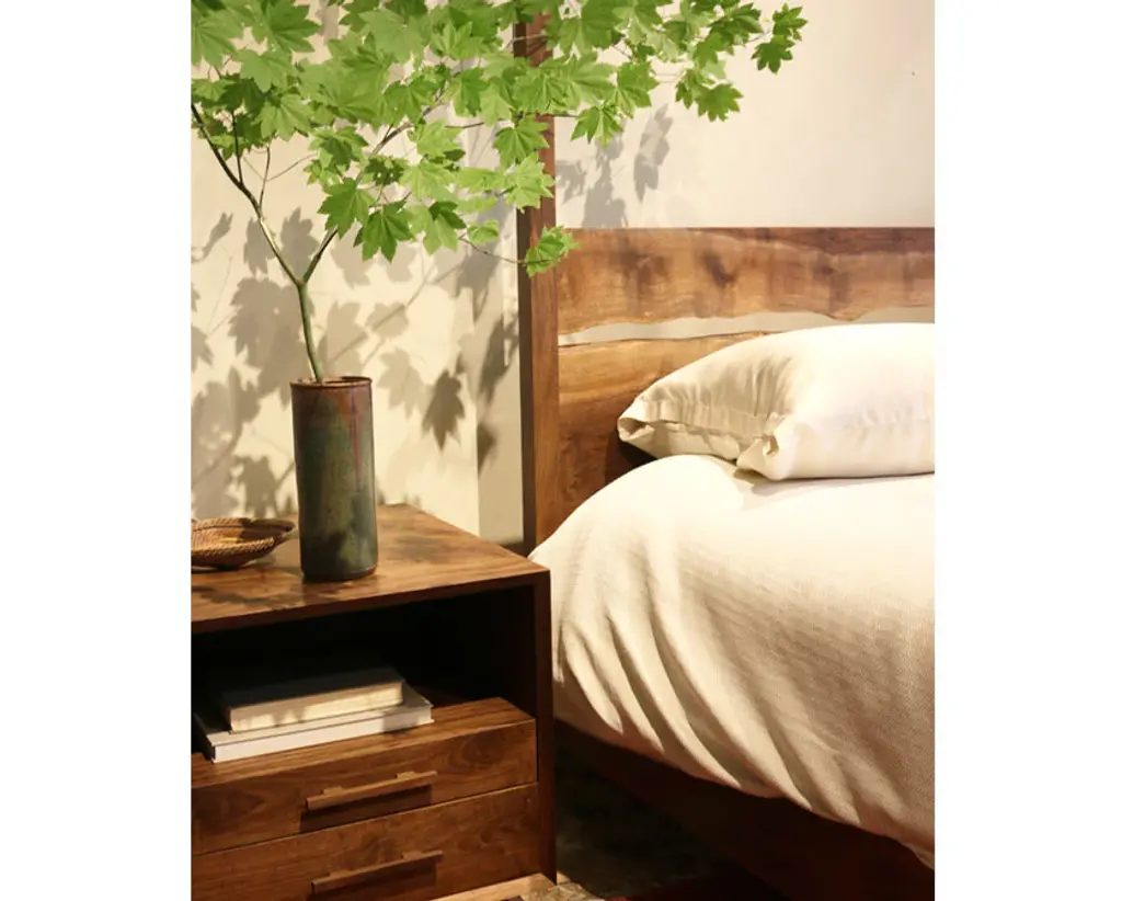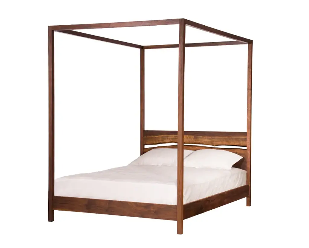 An updated version of a classic wooden bedframe design, our Modern Pencil Post Bed adds beauty and mystique to your bedroom. The design features square posts, low profile headboard, and an option for a Live-Edge Split headboard. This piece is part of our collection of live edge modern furniture skillfully handcrafted in Oregon.* This bed is built with a platform set up. Please call for mattress and boxspring set up prices and dimensions.