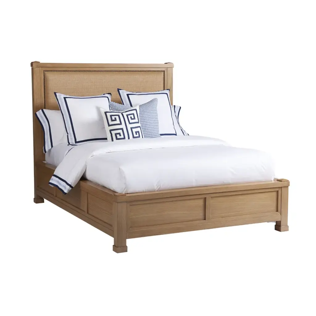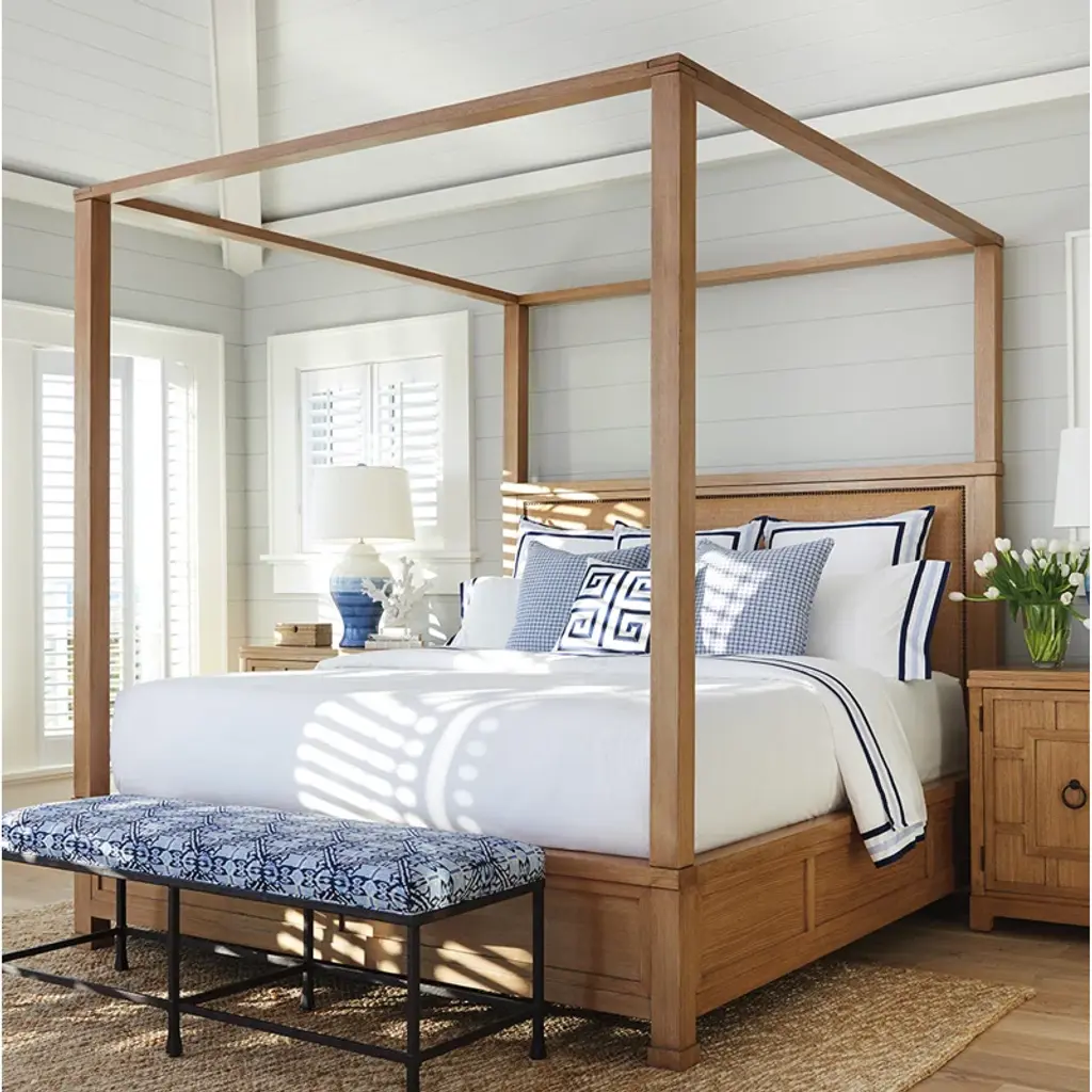 The shore cliff canopy bed offers a dramatic interpretation of the new traditional style. The headboard fabric, in a natural raffia coloration, is framed with aged bronze nailhead trim, creating an ideal backdrop for showcasing layers of pattern and color on the bedding ensemble. This bed can be converted to a low-post configuration using decorative post caps in aged bronze that are included with the piece.