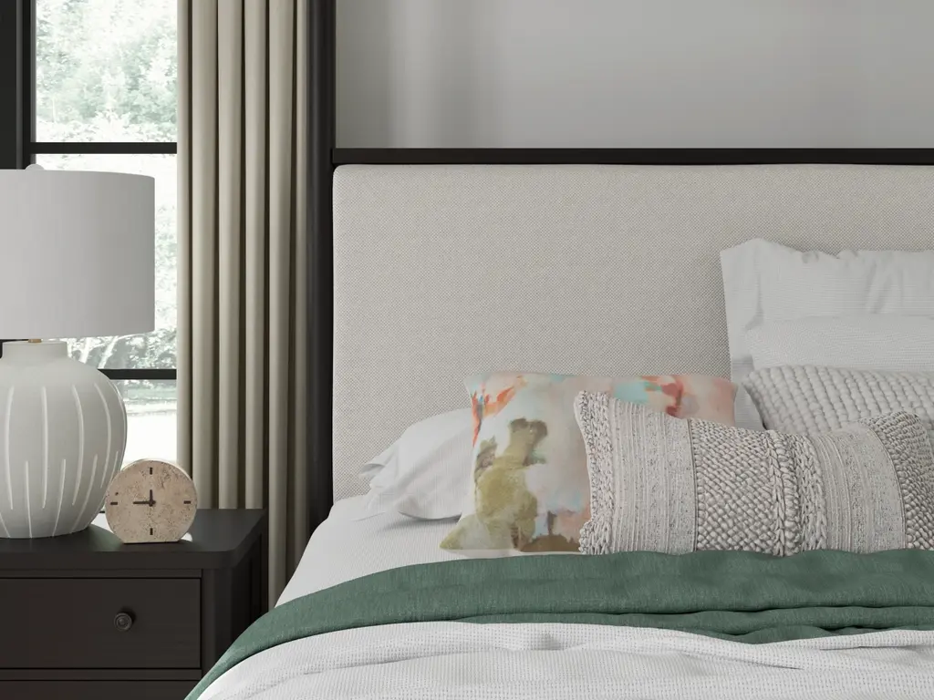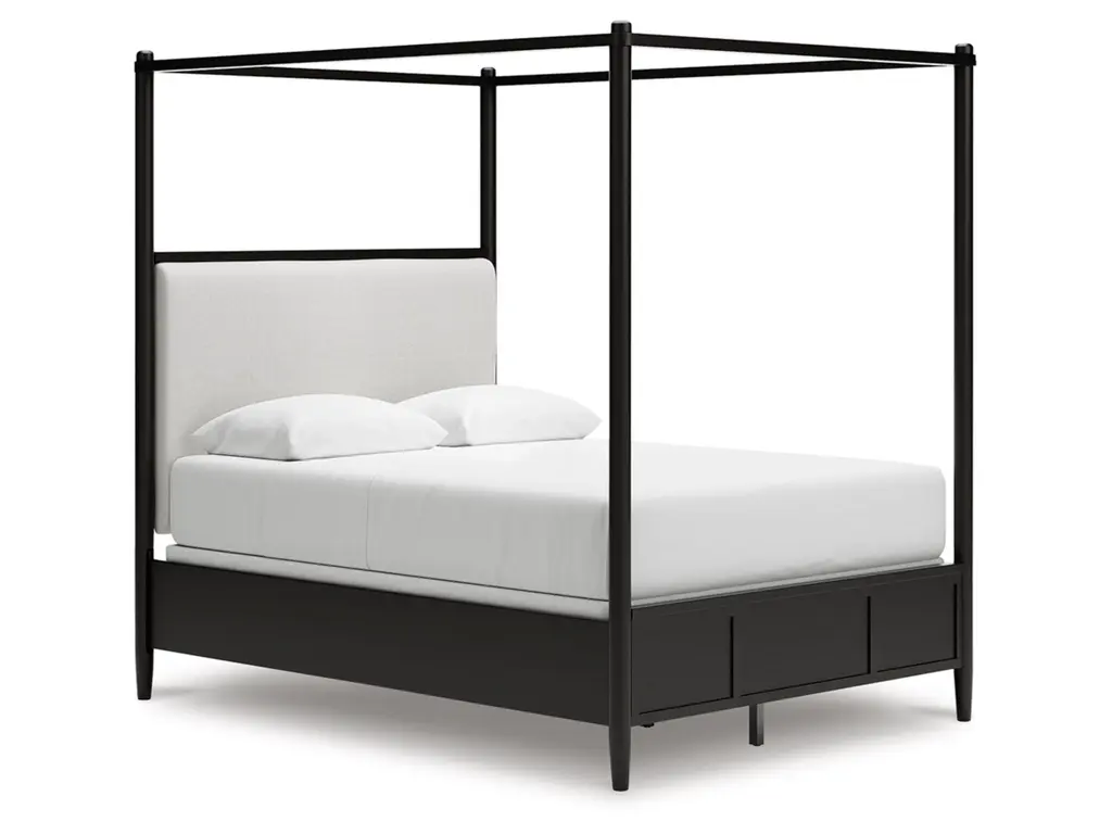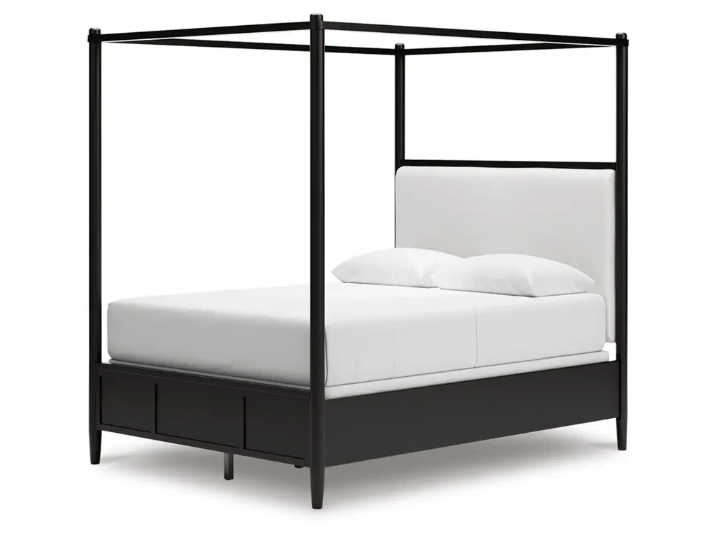 Farmhouse and contemporary design, balanced beautifully. The Portdown queen upholstered canopy bed merges simple aesthetics and round posts for an updated sensibility. Its cushioned headboard sports Next-Gen Nuvella™ performance fabric that's easy to clean. A modern French black finish with deep warm brown undertones perfectly punctuates this casually inviting bed.