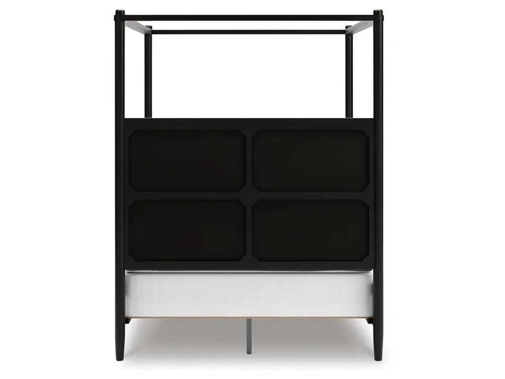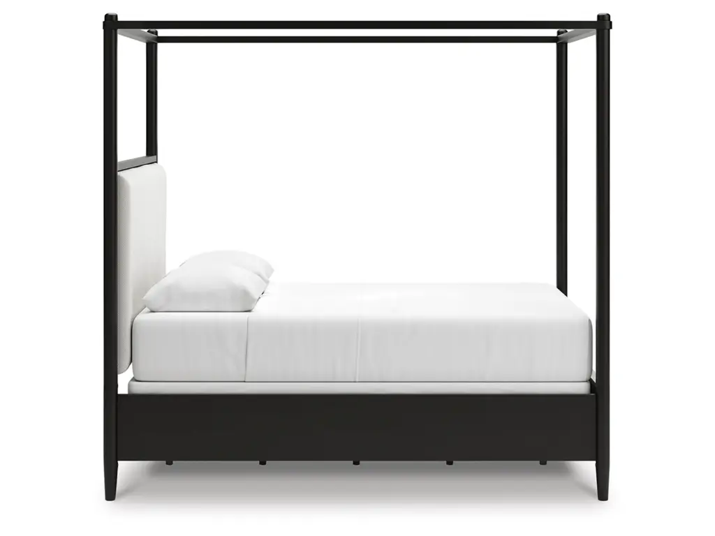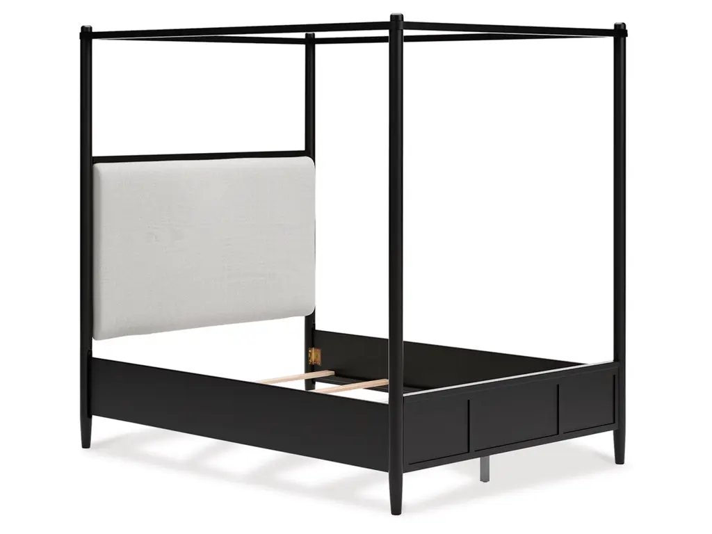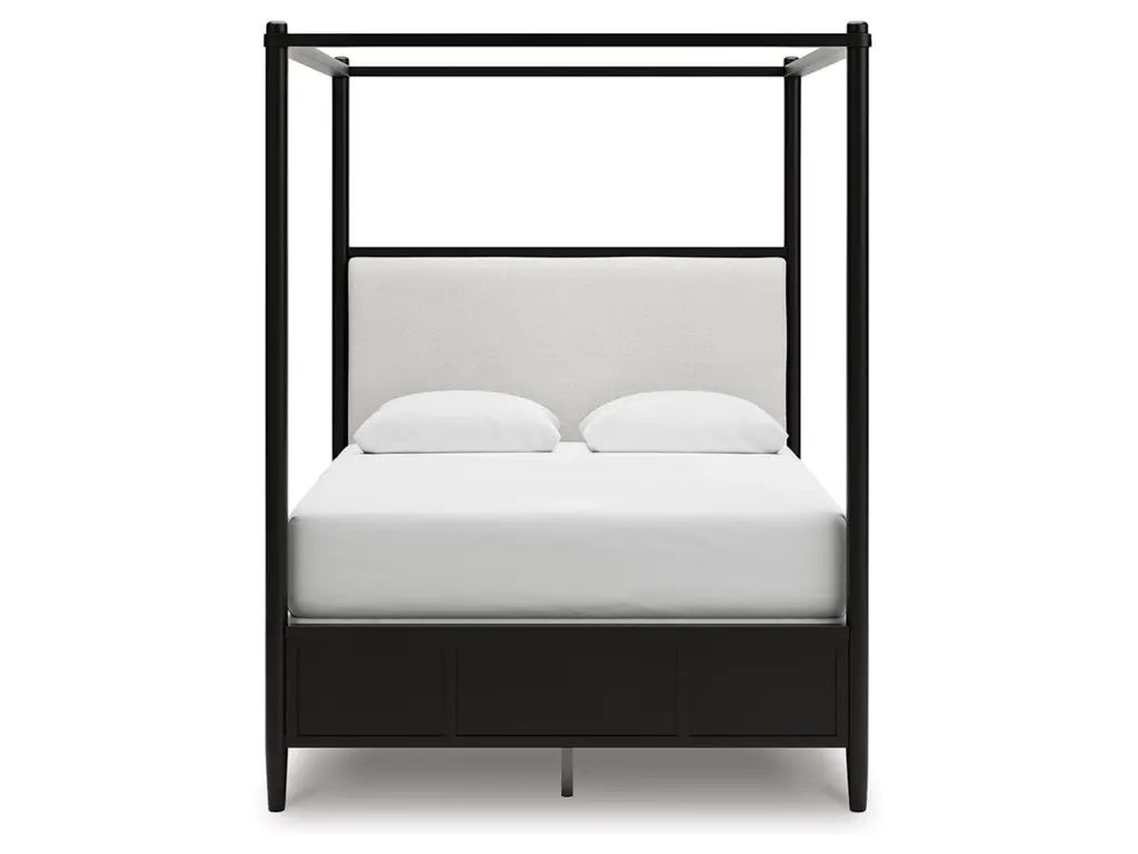 Farmhouse and contemporary design, balanced beautifully. The Portdown queen upholstered canopy bed merges simple aesthetics and round posts for an updated sensibility. Its cushioned headboard sports Next-Gen Nuvella™ performance fabric that's easy to clean. A modern French black finish with deep warm brown undertones perfectly punctuates this casually inviting bed.