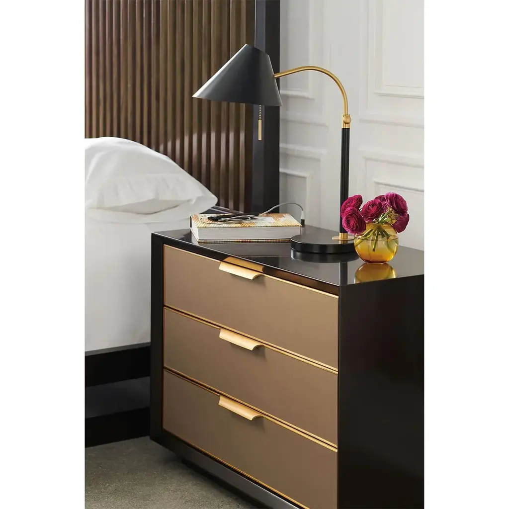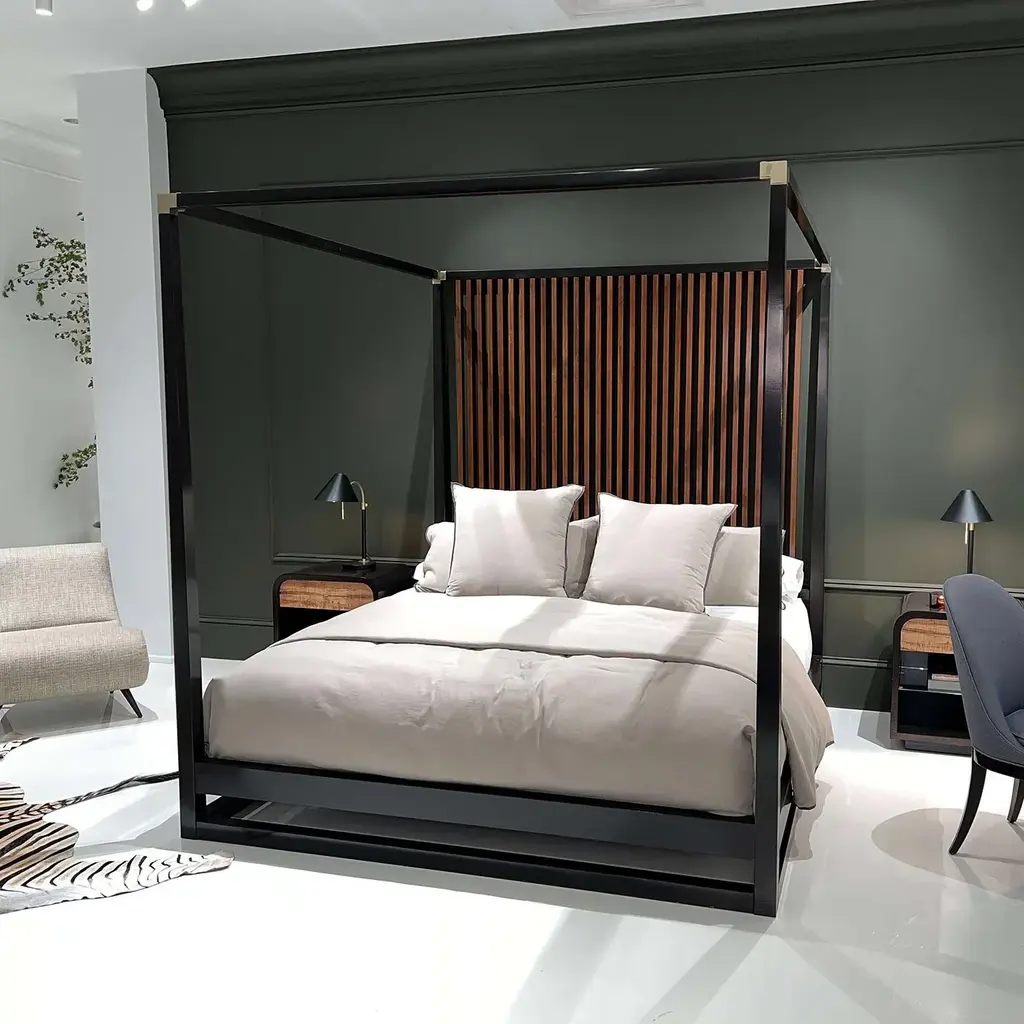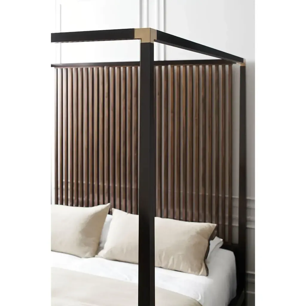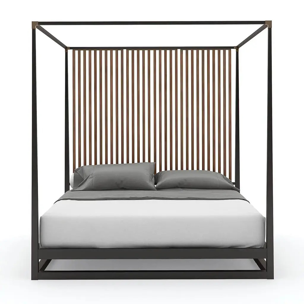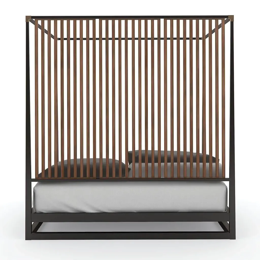 With a dramatic vertical slat back design. It has an architecturally inspired design that features Rich Walnut vertical slats, warmly contrasted by a dark chocolate canopy and posts accented with champagne gold brackets. Dimensions: 67" W x 87" D x 88" H Mattress Opening: 62 between side rails 82 Front of headboard to back of footboard Floor to top of slat: 9.875 Floor to top of side rail: 10.5