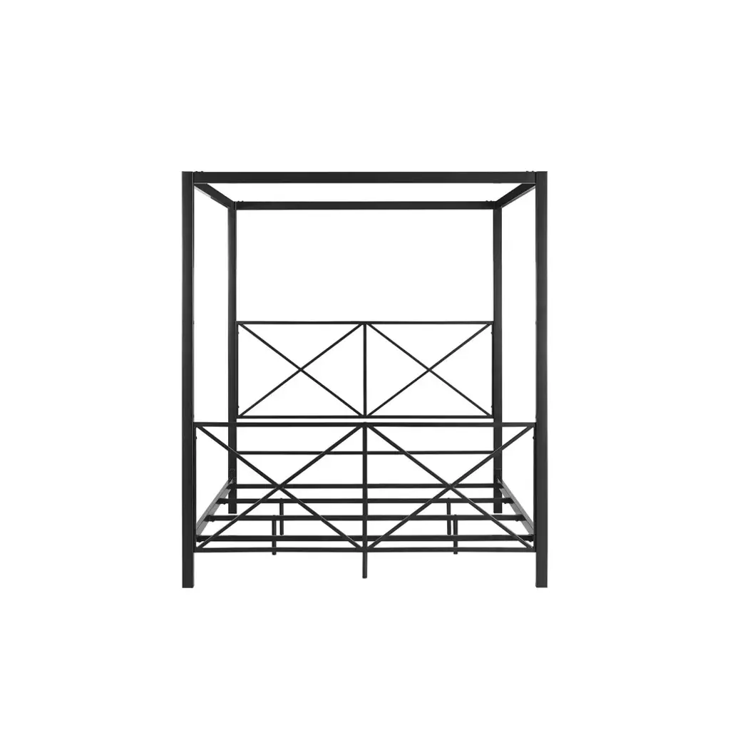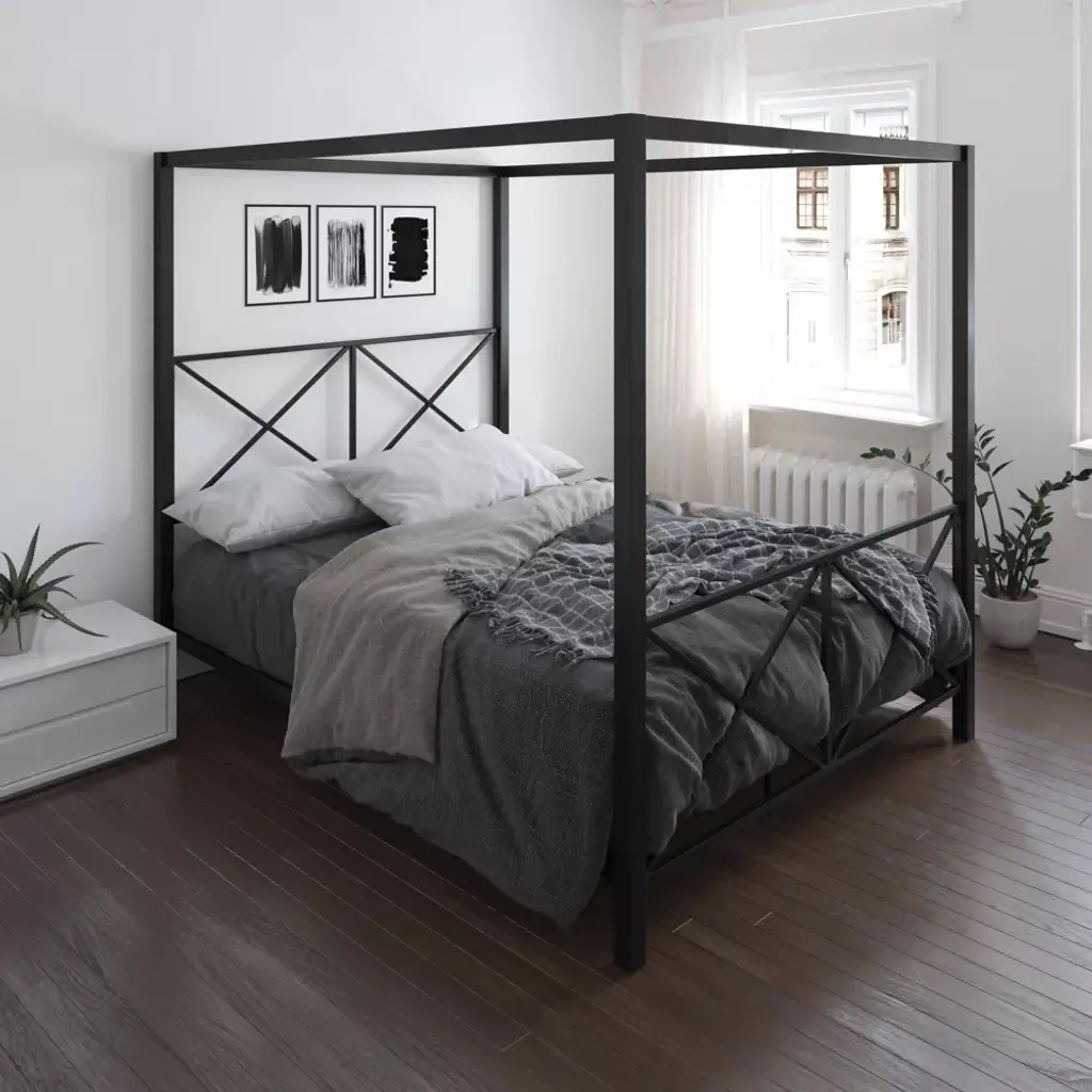 The Rosedale Metal Canopy Queen Bed is a sleek and modern bed with dramatic presence. Made out of metal with a powder-coated finish, this canopy bed is as sturdy as it is elegant. The headboard and foot board have a coordinating crisscross design that's inspired by antique bed designs but with a simplified, updated feel. The tall canopy is ideal for draping with fabric or curtains, which are wonderful for keeping warm and creating a mood.