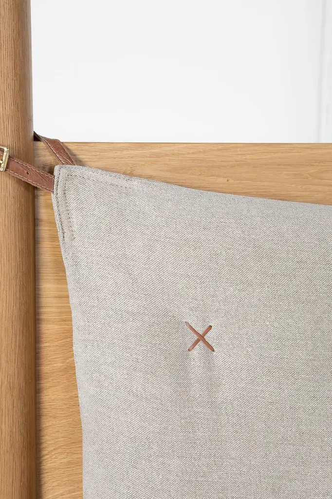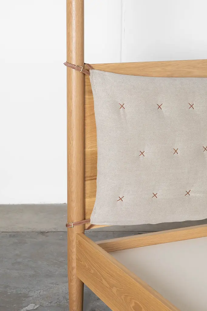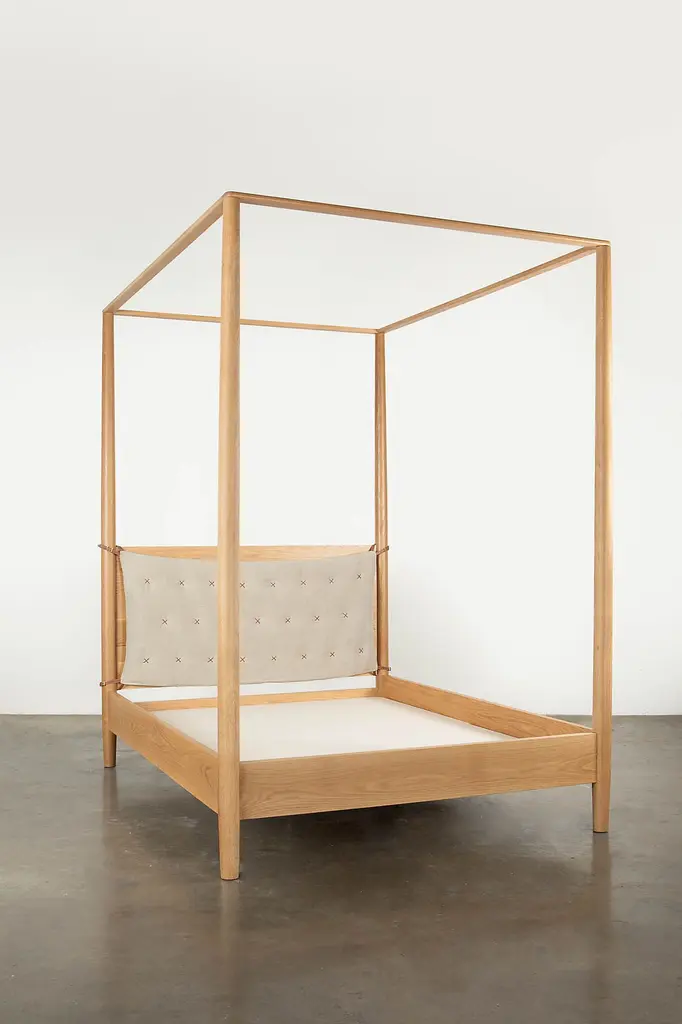 Please note that all sales are final Shoppe Amber Interiors beloved Penny Bed in canopy form! This solid oak bed comes with an upholstered headboard featured in Clay with a custom leather X stitch. The Penny Canopy Bed is part of the 'Made by Shoppe' furniture line, designed by Amber Lewis and handmade in Los Angeles. Featured in Ebonized Oak with a Moss cushion. This item is made to order. Please note that all made to order furniture items will be shipped via White Glove Delivery. The Shoppe team will reach out to arrange delivery after you place your order. Dimensions Queen - Overall: 86"L x 66.5"W x 96"H, Headboard Height: 48"H, Side Rail: 16"H Eastern King - Overall 86"L x 82"W x 96"H, Headboard Height: 48"H, Side Rail: 16"H This is a slat bed. A Bunkie Board or a low profile box spring is suggested.