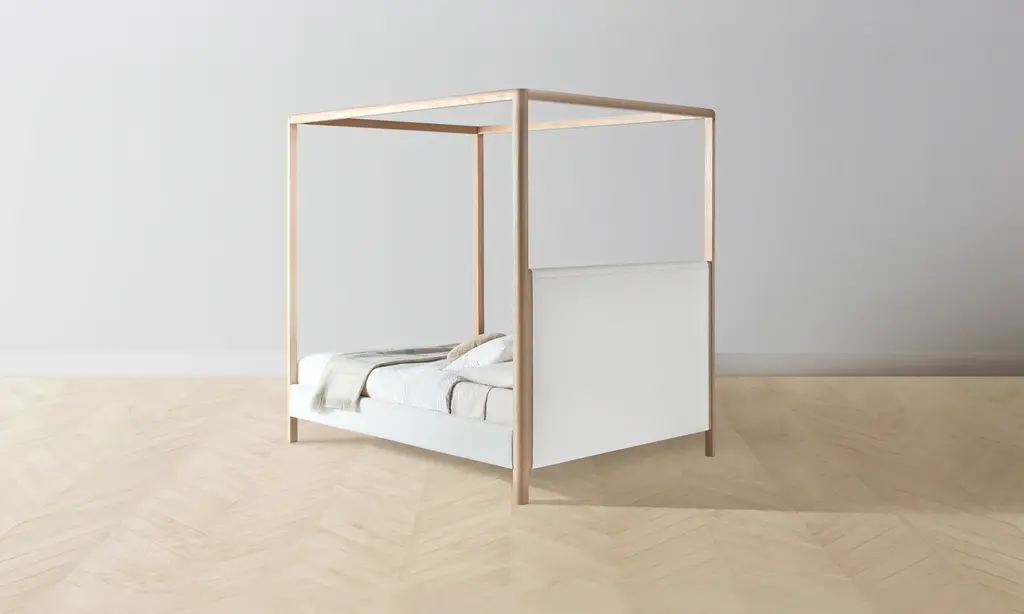 The Thompson Canopy Bed is an expression of graceful simplicity. It has an ash frame with rounded corners and neat upholstery along the headboard, foot rail, and sides, creating a perfect balance of rigidity and softness. Handcrafted in North Carolina.
