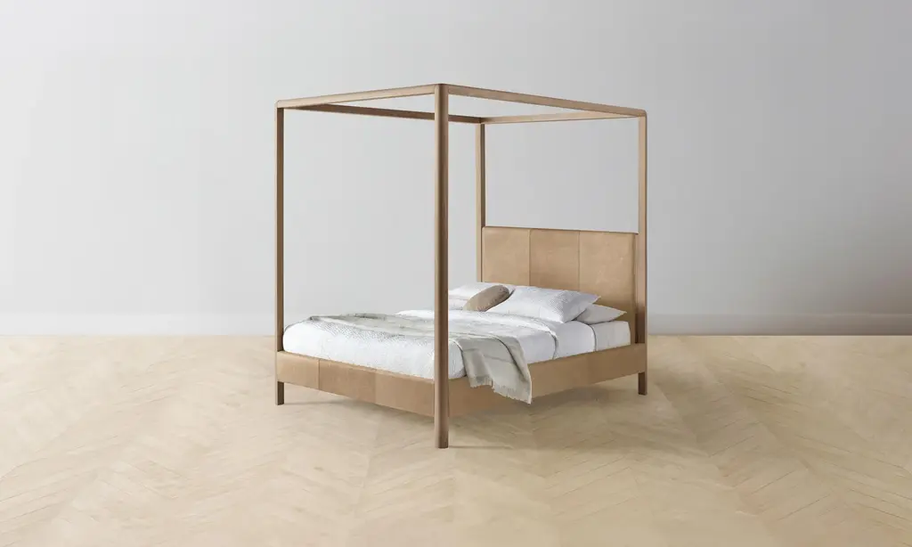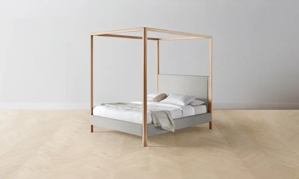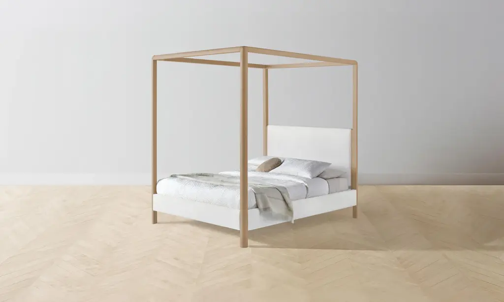 The Thompson Canopy Bed is an expression of graceful simplicity. It has an ash frame with rounded corners and neat upholstery along the headboard, foot rail, and sides, creating a perfect balance of rigidity and softness. Handcrafted in North Carolina.