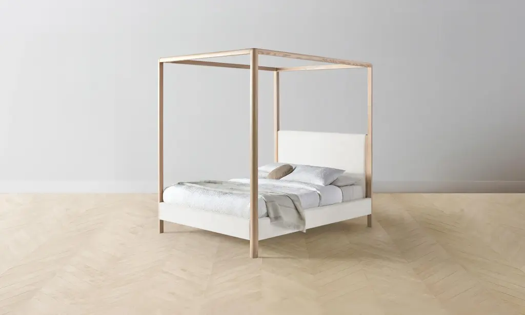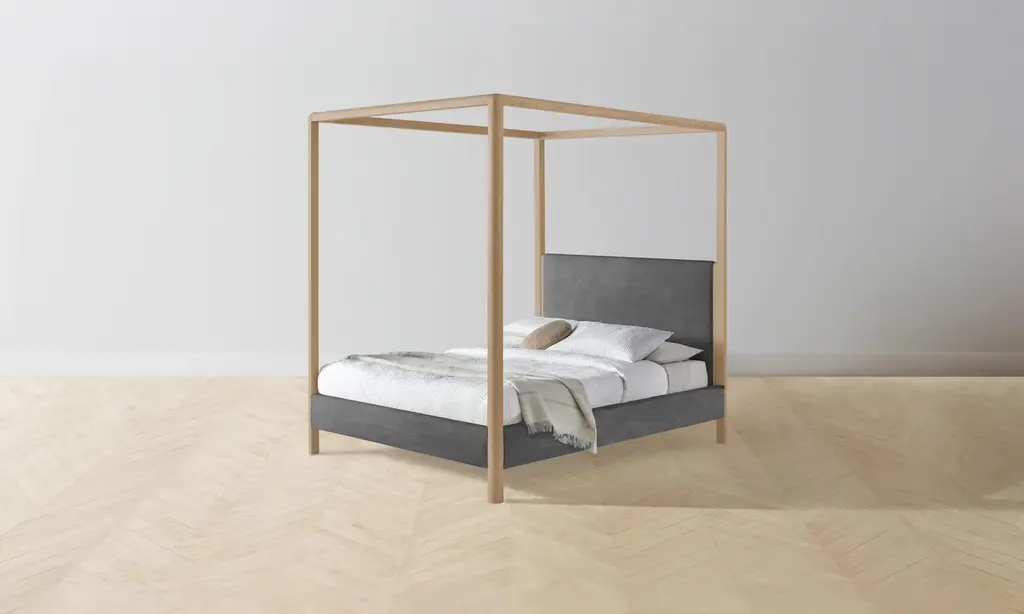 The Thompson Canopy Bed is an expression of graceful simplicity. It has an ash frame with rounded corners and neat upholstery along the headboard, foot rail, and sides, creating a perfect balance of rigidity and softness. Handcrafted in North Carolina.