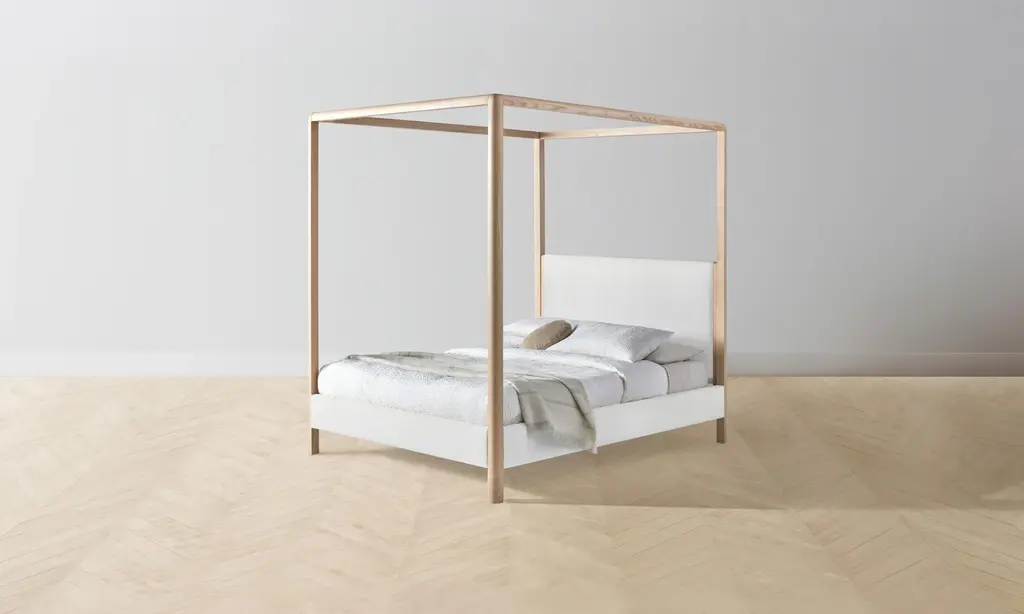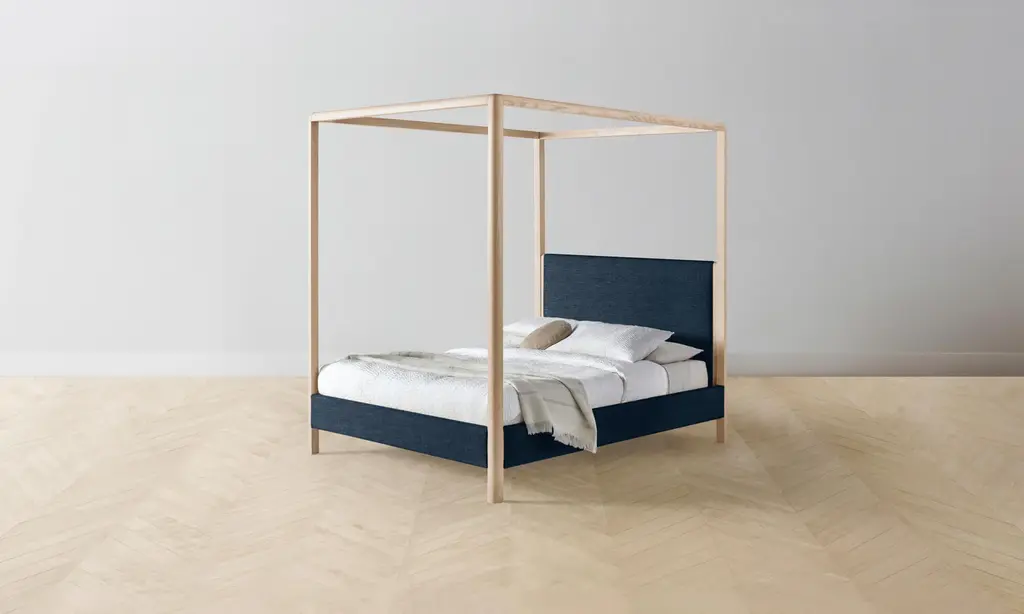 The Thompson Canopy Bed is an expression of graceful simplicity. It has an ash frame with rounded corners and neat upholstery along the headboard, foot rail, and sides, creating a perfect balance of rigidity and softness. Handcrafted in North Carolina.