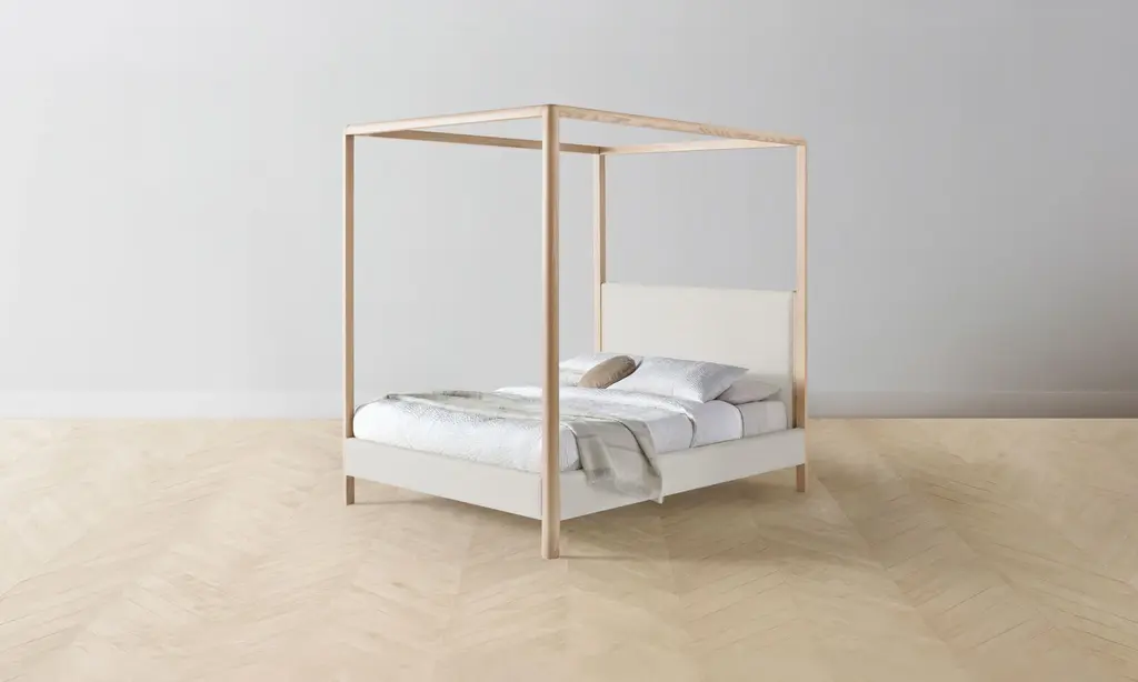 The Thompson Canopy Bed is an expression of graceful simplicity. It has an ash frame with rounded corners and neat upholstery along the headboard, foot rail, and sides, creating a perfect balance of rigidity and softness. Handcrafted in North Carolina.