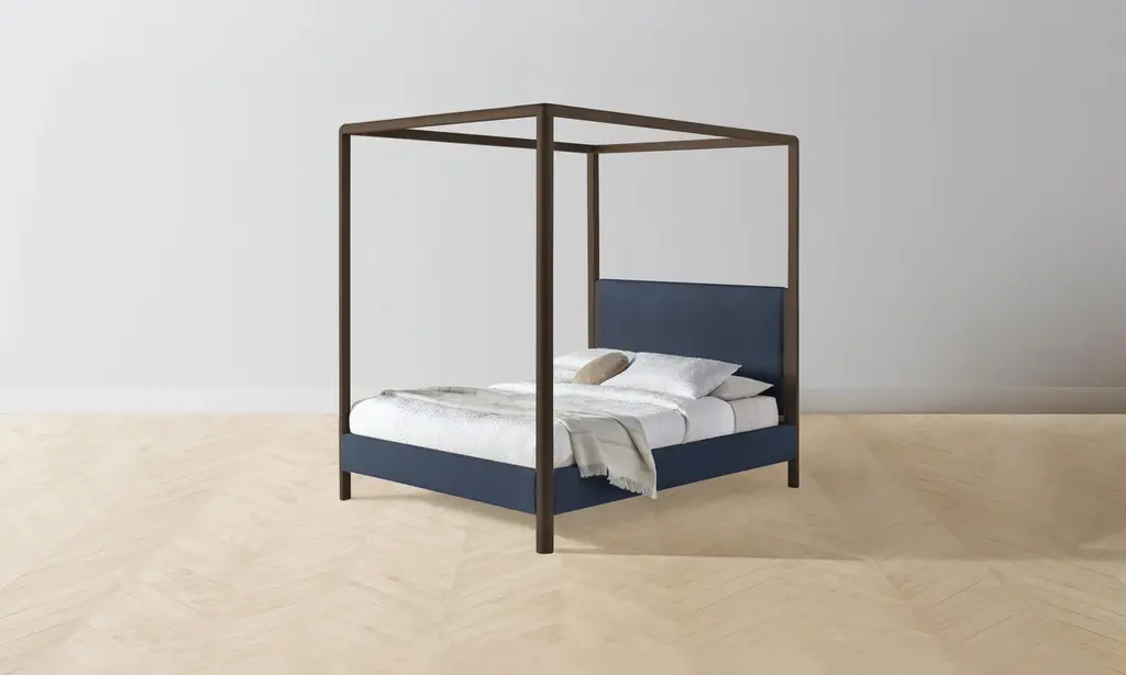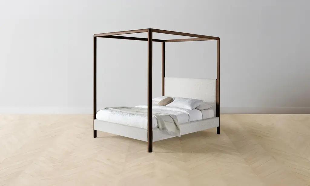 The Thompson Canopy Bed is an expression of graceful simplicity. It has an ash frame with rounded corners and neat upholstery along the headboard, foot rail, and sides, creating a perfect balance of rigidity and softness. Handcrafted in North Carolina.