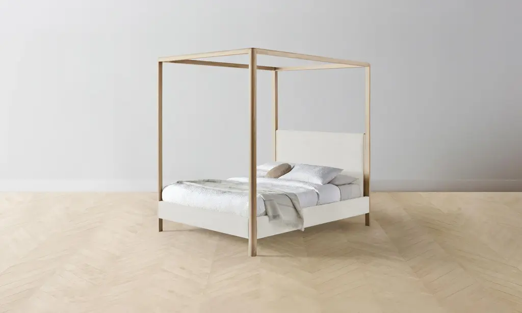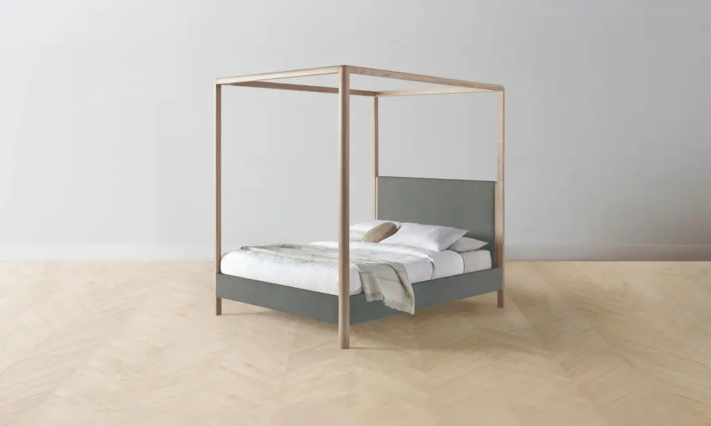 The Thompson Canopy Bed is an expression of graceful simplicity. It has an ash frame with rounded corners and neat upholstery along the headboard, foot rail, and sides, creating a perfect balance of rigidity and softness. Handcrafted in North Carolina.