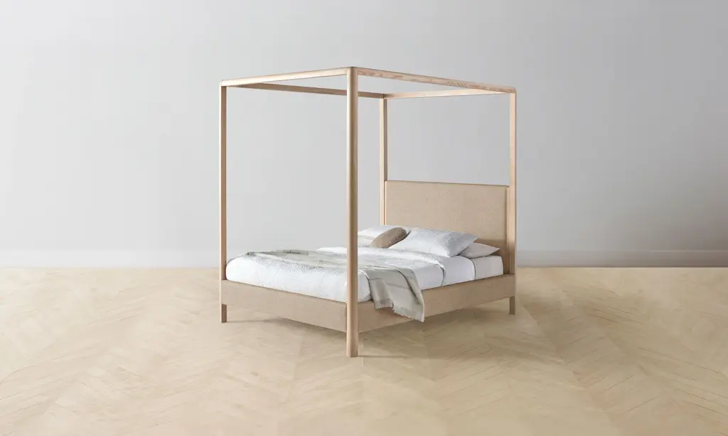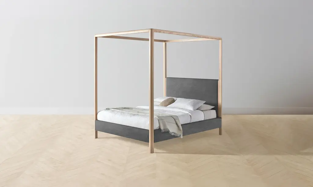 The Thompson Canopy Bed is an expression of graceful simplicity. It has an ash frame with rounded corners and neat upholstery along the headboard, foot rail, and sides, creating a perfect balance of rigidity and softness. Handcrafted in North Carolina.