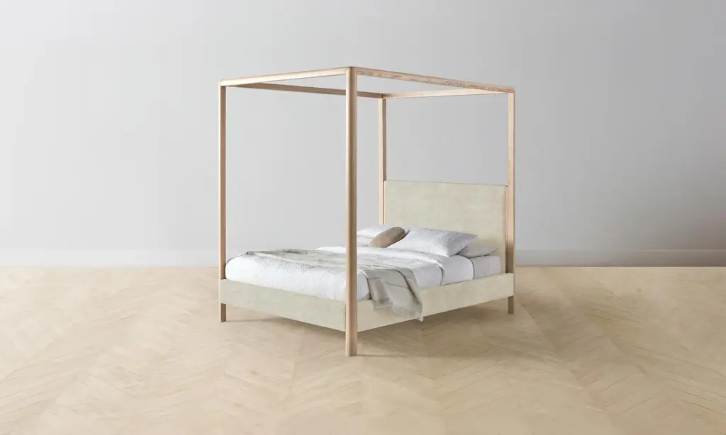 The Thompson Canopy Bed is an expression of graceful simplicity. It has an ash frame with rounded corners and neat upholstery along the headboard, foot rail, and sides, creating a perfect balance of rigidity and softness. Handcrafted in North Carolina.
