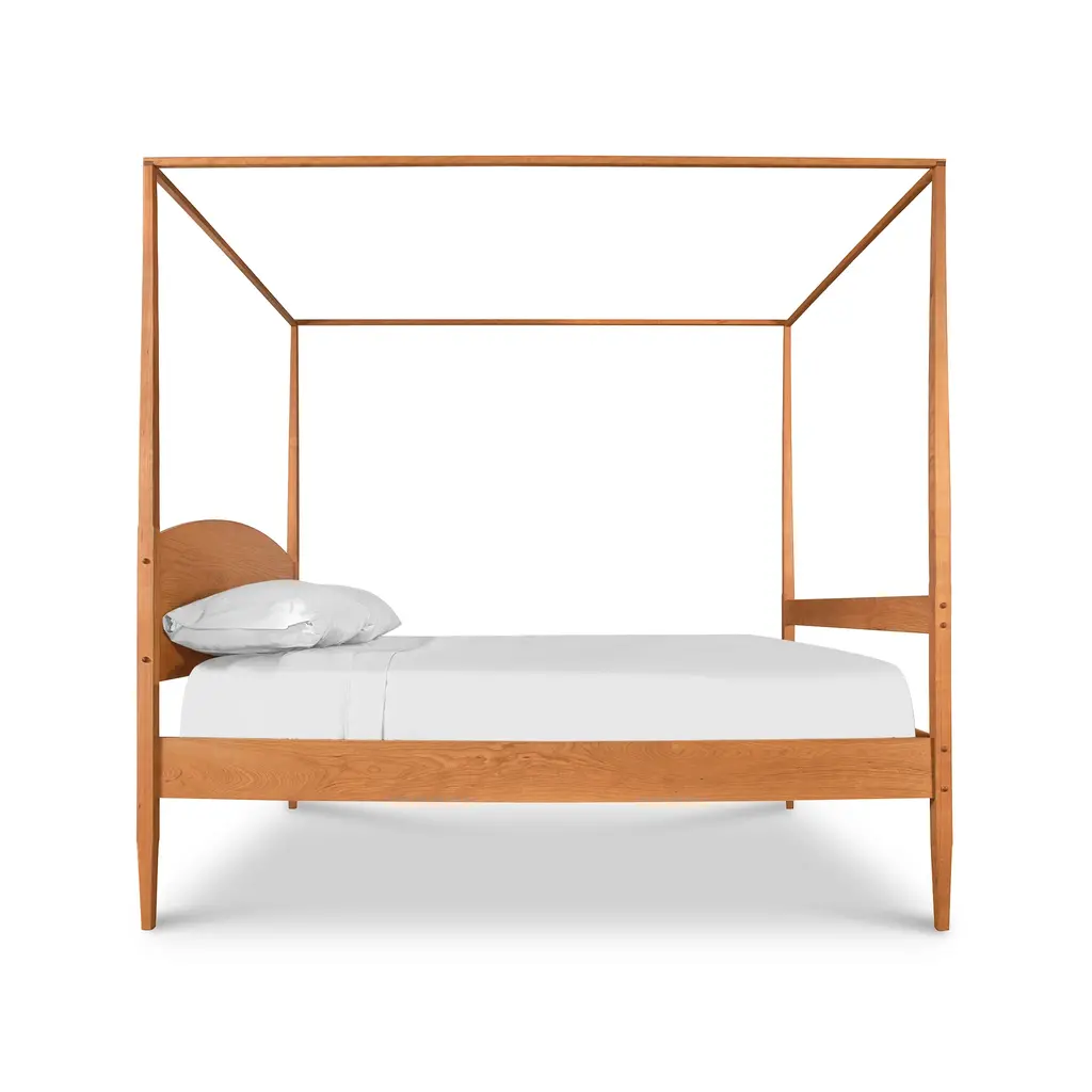 The wooden poster bed you have been looking for! Our Shaker Four Poster Bed with Canopy features solid wood construction, clean lines, tapered legs, a curved headboard and a canopy frame. Handmade with expert craftsmanship to last for generations, it's so comfortable and sturdy, you won't need a box spring! Made for you in Vermont in your choice of natural solid Cherry, Maple or Walnut. Natural finish enhances the grain and color of the wood. Base price represents twin size bed in natural cherryShown in queen size platform bed in natural cherryMatching furniture available in our Vermont Shaker Furniture CollectionPlease note that the product images shown for this bed are represented with a standard 10" thick mattress.
