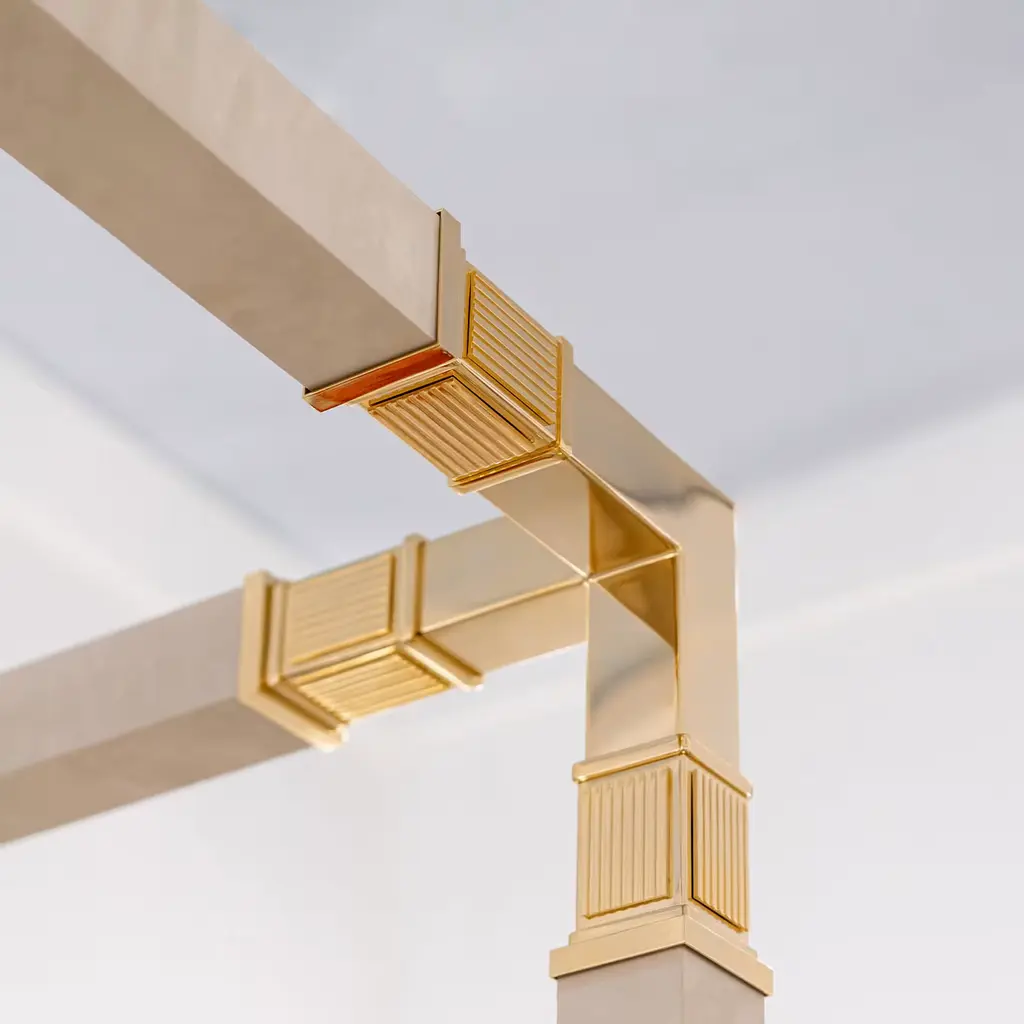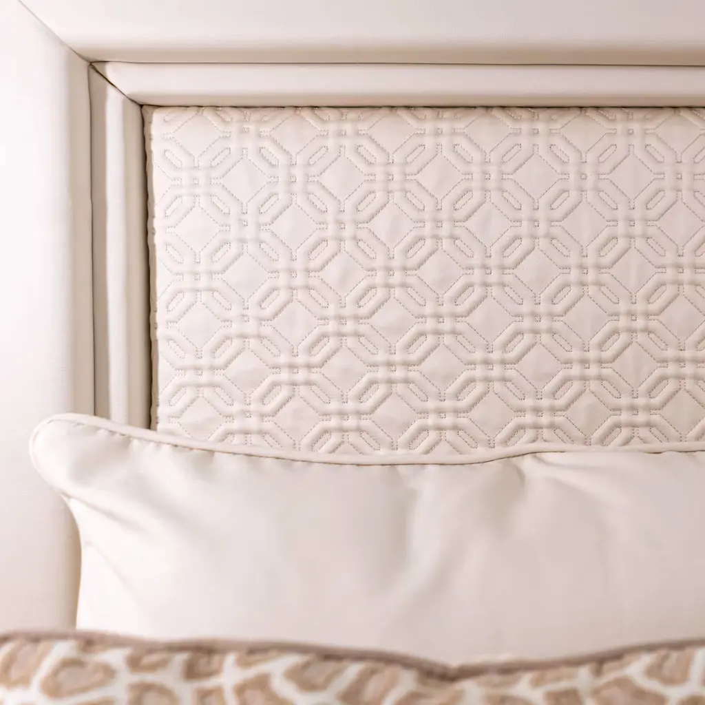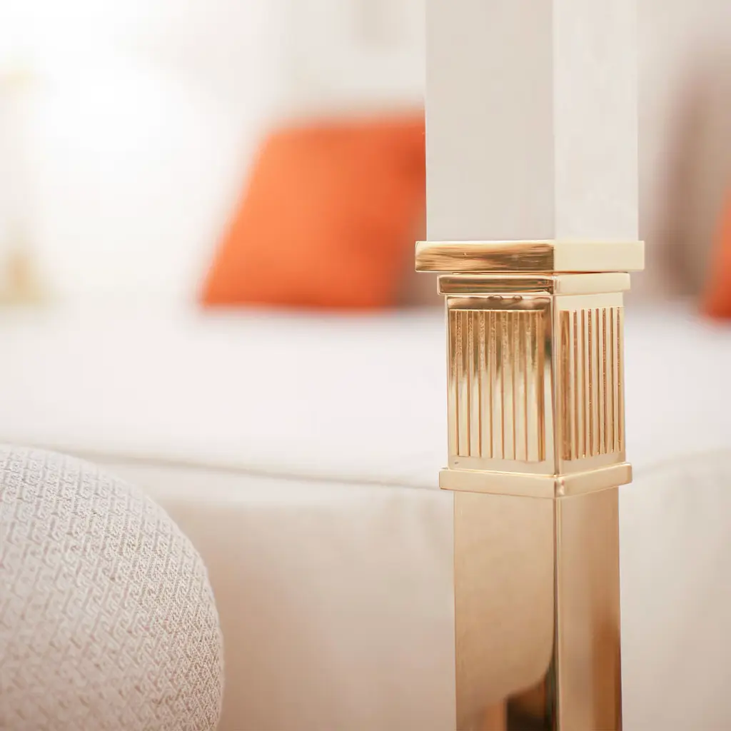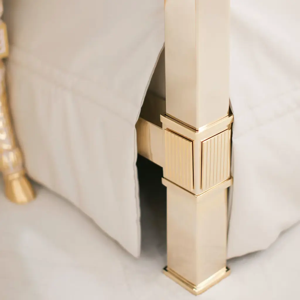 Opulence and refinement splendidly merge in this double bed, made strikingly romantic by its canopy design. Combining glistening 24K gold-plated bronze details with genuine white Nubuckcleather, it reveals an unmistakable sartorial charm further emphasized by the pattern of octagons minutely embroidered on the headboard's fabric cover. A luxurious addition to classic-style bedrooms.