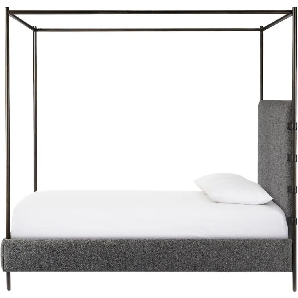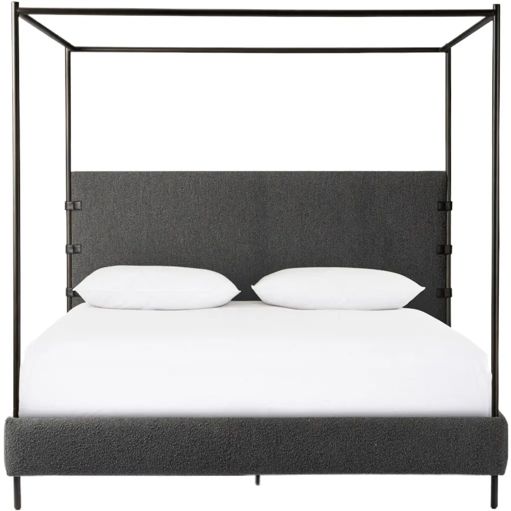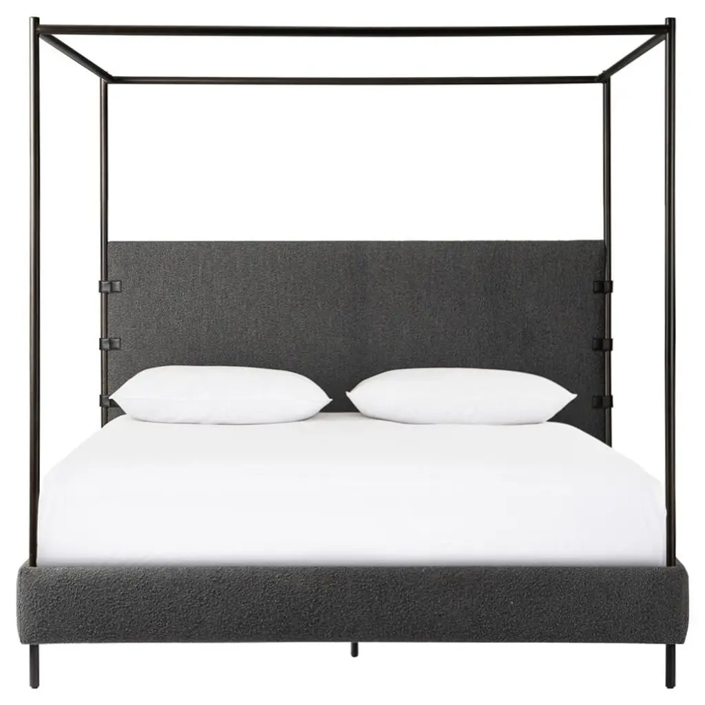 Bring texture into play with the Winslow Canopy Bed. This iron canopy bed features a headboard upholstered in a fabric that adds a touch of elegance and sophistication. Designed with a focus on material-driven contrast, it requires a standard box spring and is not compatible with an adjustable mattress. Elevate your bedroom with this beautifully crafted piece that seamlessly blends style and functionality.