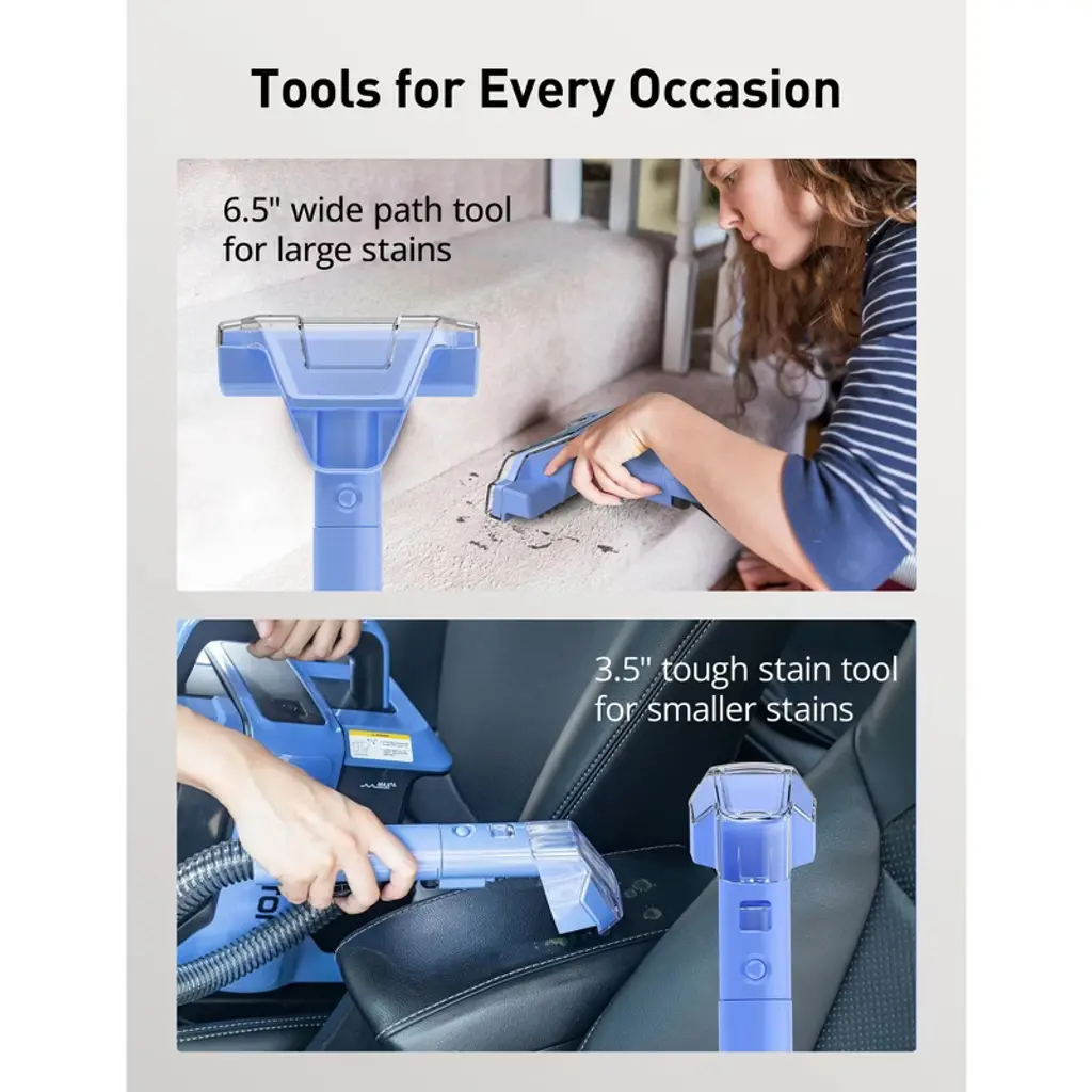 Our portable carpet cleaner, with 11kPa suction power, efficiently tackles pet stains and leaves carpets clean. It includes two tools: a 6.5" wide path tool for large stains and a 3.5" tough stain tool for smaller ones. This versatile cleaner is perfect for fabrics, sofas, mattresses, car seats, and more. It's lightweight, portable, and has a big water tank with twin tanks for easy cleaning.