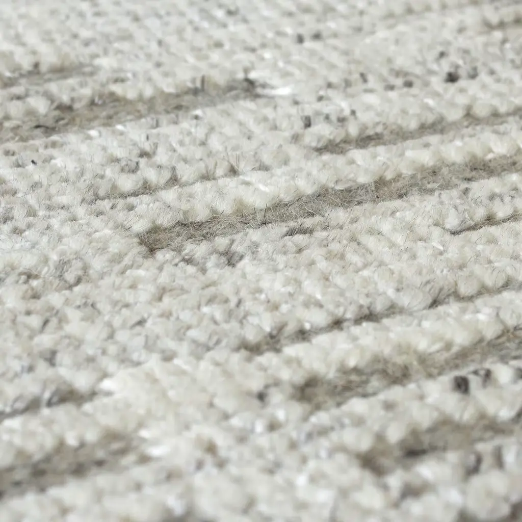 The exotic look of this beige carpet can be brought back to the most ancient Moroccan culture and its textile tradition. Its dynamic texture is given by the use of strands that alternate both in color and in length. This item is made with a combination of wool and cotton and its dimensions can be customized upon request.