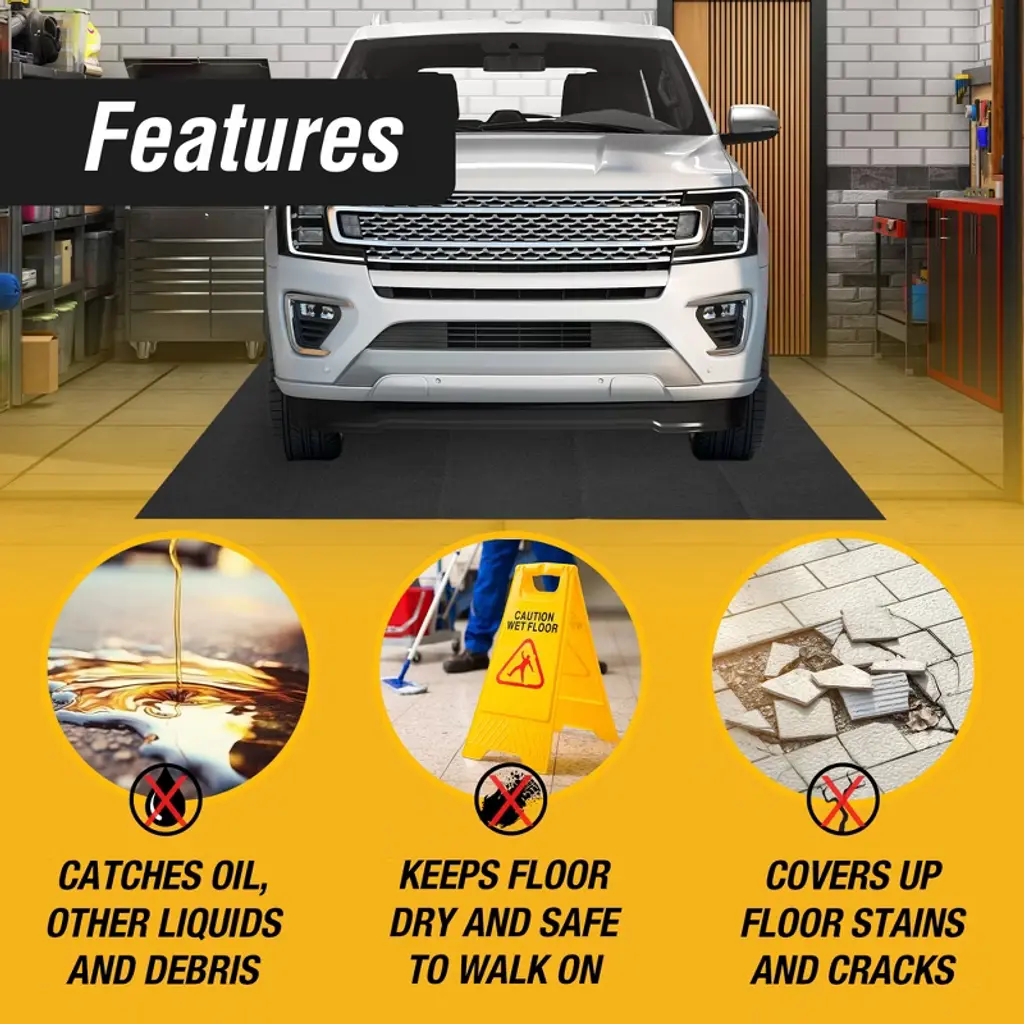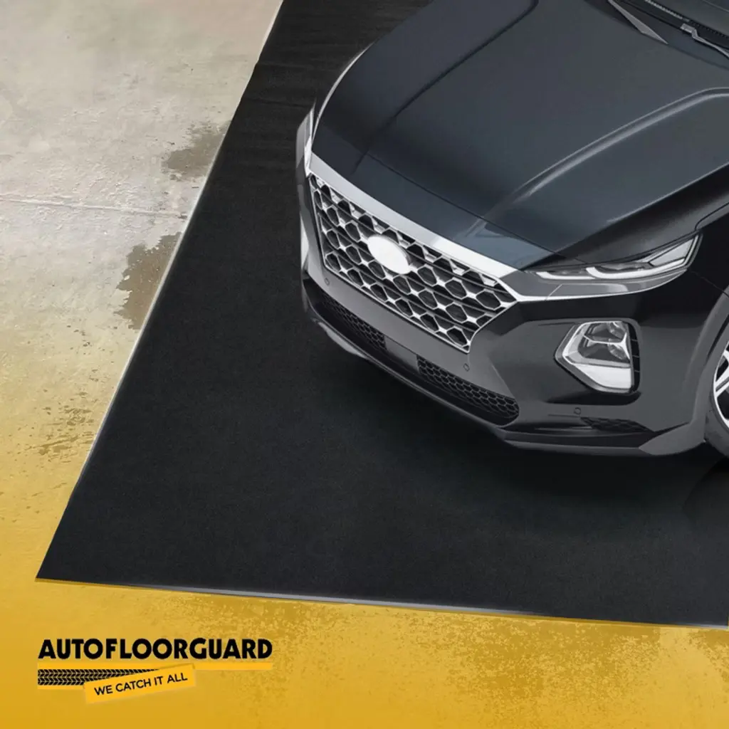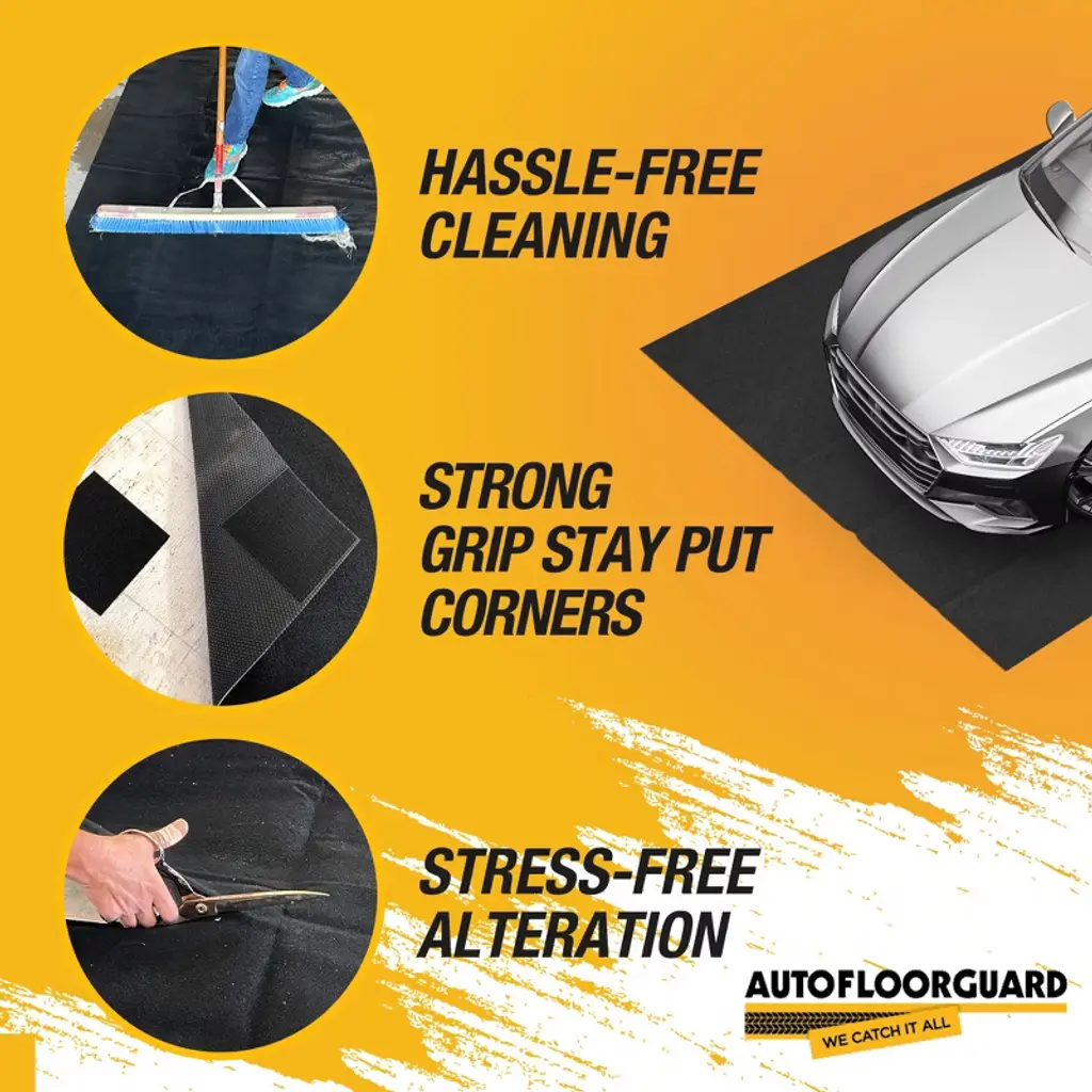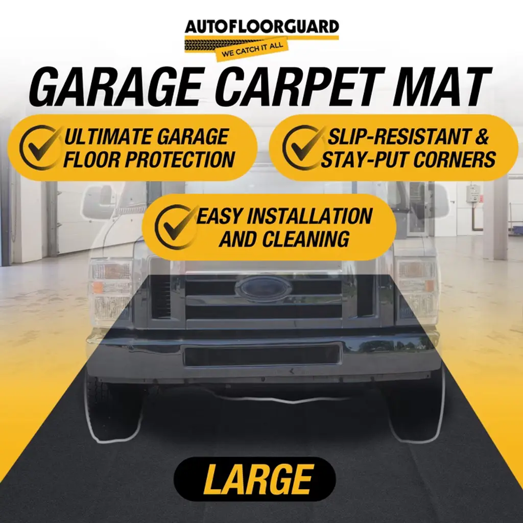 Gone are the days of using old cardboard boxes to protect your garage or shop floor from oil stains, mud, or stray debris. The AutoFloorGuard carpet mat protects your garage with a design that stays in place and keeps outside elements on the mat only. This carpet mat offers a variety of options to safely store your motorcycle, golf cart, RV, ATV, Automobile, bike, or other motorized vehicles year-round. Improved packaging enables this mat to lay flat right out of the box. The black color of the mat easily hides dirt and is made to not fade over time. Easy to maintain and clean, simply vacuum, hose, power-wash, or squeegee for quick and easy maintenance. Unlike tarps or do-it-yourself methods to protect your garage floor, this containment mat is engineered with stay-put corners. This garage accessory features a textured nonslip backing, so the mat will not slip out of place or need constant adjustment. You don't have to tolerate the outdoors ruining your garage floor. This Carpet Mat from AutoFloorGuard provides the protection you need.