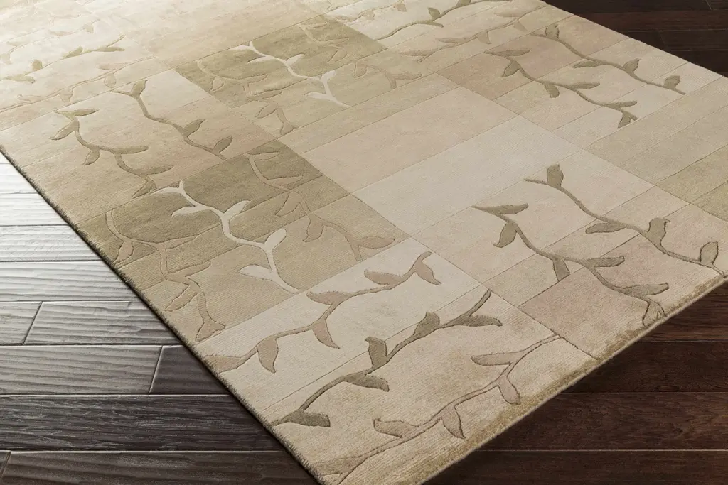 Collection: Bissell Colors: Light Brown, Dark Brown, Off White, Medium Gray Construction: Hand Knotted Material: 100% NZ Wool Pile: Medium Pile Pile Height: 0.31" Styles: Animal Made In: India Thickness: 0.39" Price Range: $$$$$ (Affordable)