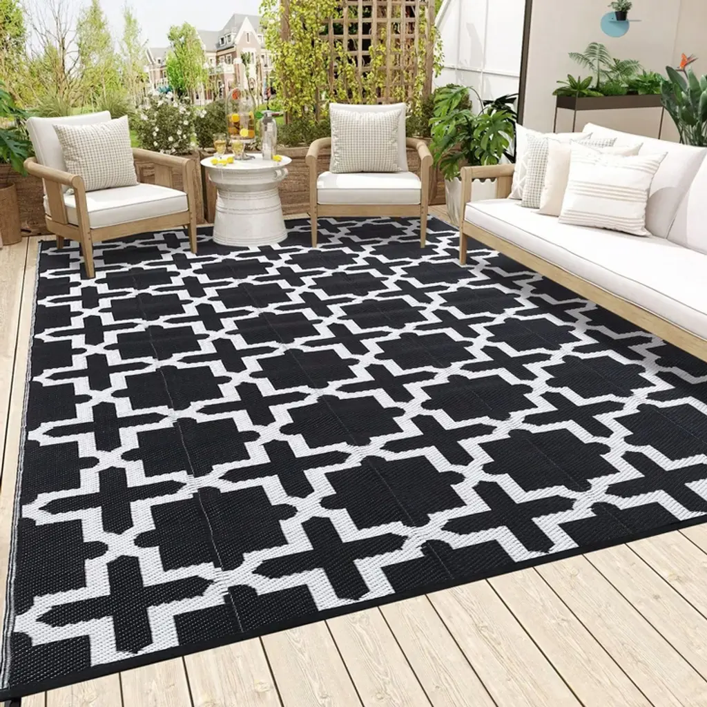 Black White 6'x9' Outdoor Washable Carpet, Plastic Straw Carpet Lightweight Waterproof, Reversible Patio Carpet For Deck Balcony Beach Rv