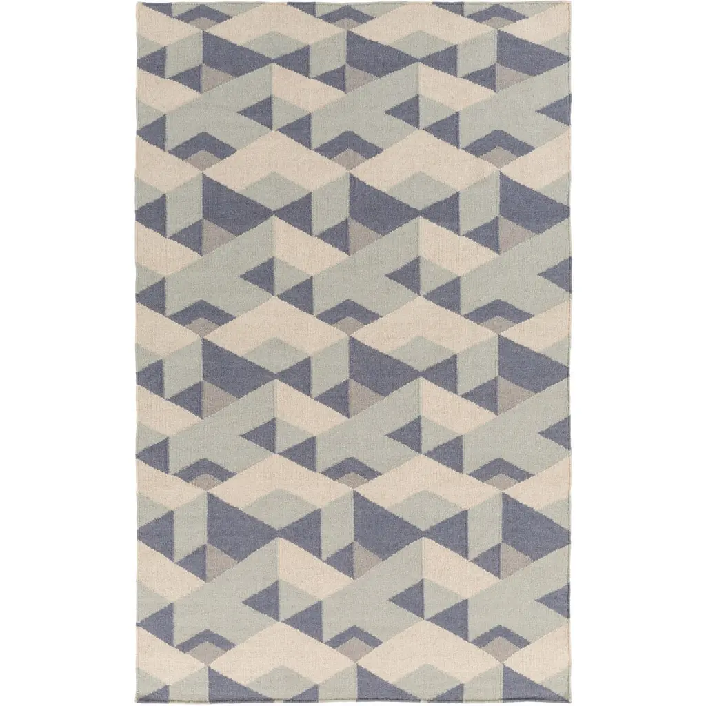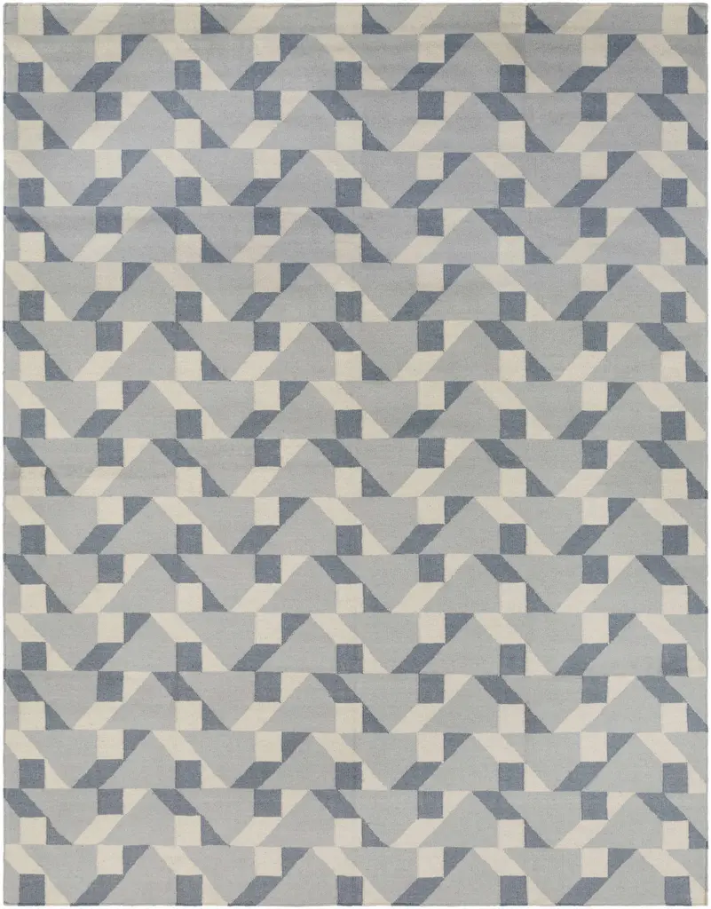 Collection: Bonita Colors: Denim, Ivory, Slate Blue Construction: Hand Woven Material: 100% Wool Pile: No Pile Styles: Contemporary Made In: India Thickness: 0.16" Price Range: $$$$$ (Affordable)
