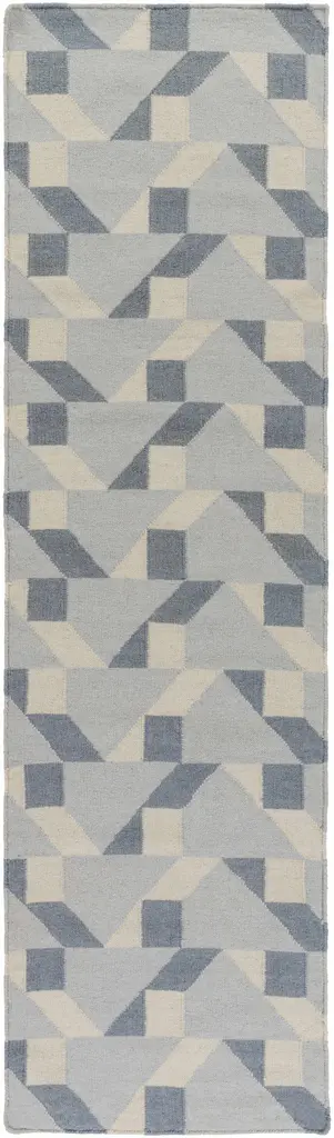 Collection: Bonita Colors: Denim, Ivory, Slate Blue Construction: Hand Woven Material: 100% Wool Pile: No Pile Styles: Contemporary Made In: India Thickness: 0.16" Price Range: $$$$$ (Affordable)