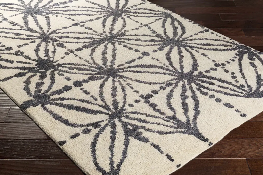 Collection: Bonnyman Colors: Black, Ivory, Medium Gray Construction: Hand Woven Material: 100% Jute Pile: Medium Pile Pile Height: 0.31" Styles: Bohemian/Global Made In: India Thickness: 0.39" Price Range: $$$$$ (Affordable)