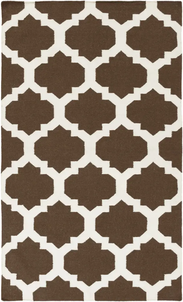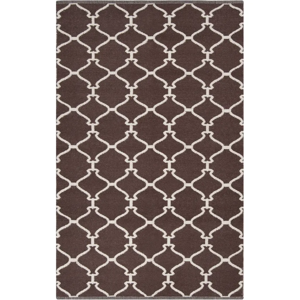 Collection: Bullock Colors: Ivory, Dark Brown Construction: Hand Woven Material: 100% Wool Pile: No Pile Styles: Transitional Made In: India Price Range: $$$$$ (Most Affordable)