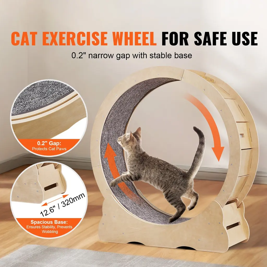 Built to Last and Secure: This cat exercise wheel is made from solid multi-layer wood (birch and poplar) with a 0.5"/12 mm thickness and an ultra-narrow 0.2" gap to prevent paw injuries. The widened base and running track deliver added stability. It offers many health advantages to cats, such as mitigating obesity risks and enhancing joint flexibility, ensuring their contentment. Tranquil and Noise Reduction: Equipped with an integrated silent wheel and a bottom noise-reduction, this double noise reduction design creates a quiet and pleasant exercising environment for your pets, while also improving the indoor atmosphere. Suitable for All Cat Sizes: For 43.3 inch option: With an external diameter of 43.3 in/1100 mm and an internal diameter of 39.37 in/1000 mm, this cat wheel accommodates cats of all sizes, supporting feline friends up to 25 lbs. For 35.8 inch option: With an external diameter of 35.8 in/910 mm and an internal diameter of 31.5 in/800 mm, this cat wheel accommodates cats of all sizes, supporting feline friends up to 13 lbs. For 29.5 inch option: With an external diameter of 29.5 in/750 mm and an internal diameter of 25.6 in/650 mm, this cat wheel accommodates cats of all sizes, supporting feline friends up to 8 lbs. It allows your cats to stretch and roam freely, enabling them to release their energy to the fullest. User-Friendly Design: Easy installation with pre-installed expansion screws and wheel, saving you valuable time. Included accessories like gloves, a screwdriver, and a cat teaser add extra convenience. This cat treadmill is a breeze to clean with a non-scratch detachable looped mat, easily spot-cleanable with a cloth or sponge. Versatile Cat Wheel: Featuring a locking mechanism to keep it steady, this cat running wheel is adaptable for interactive cat play, as a cat resting place, and as a furniture piece. It can be set to a stationary mode for cats running and spinning, allowing them to climb and take a nap. Cats can also frolic, chase, and keep themselves entertained! Package Content 1 x Cat Exercise Wheel 1 x Gloves 1 x Screwdriver 1 x Cat Teaser